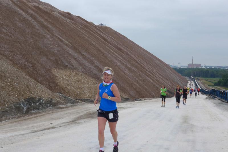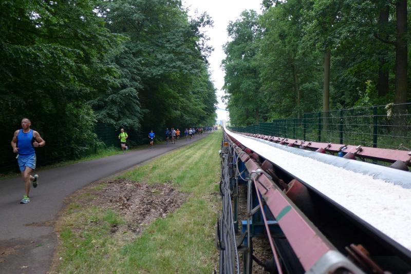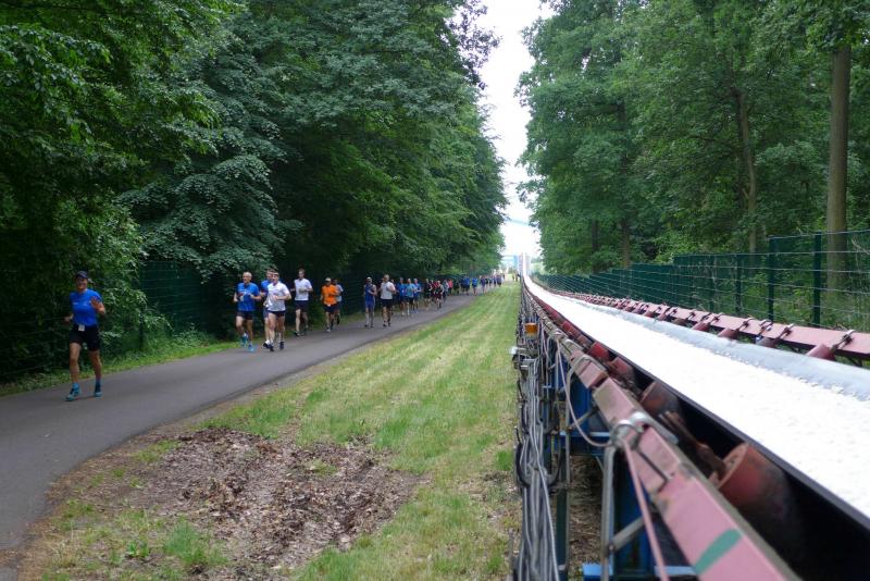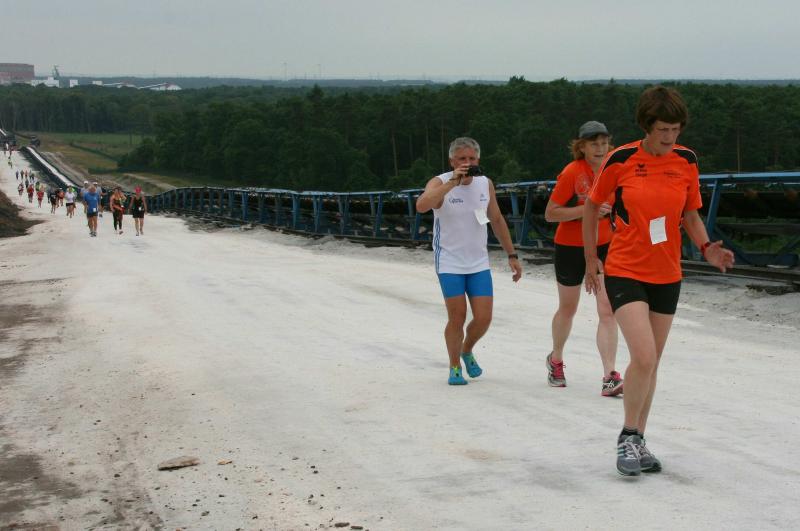 Am ersten Getränkestand noch einmal aufgetankt, lag er dann in seiner vollen Dimension vor den Läufern: Der berühmt, berüchtigte Kalimandscharo. Nun kam nicht nur für die Läufer der erste Anstieg - auch für das Förderband ging es bergauf. Der Weg auf dem hellen Abraummaterial blendete extrem. Verflixt, gab es doch beim Start bei bedecktem Himmel garkeinen Grund für den Einsatz von Sonnenbrillen.