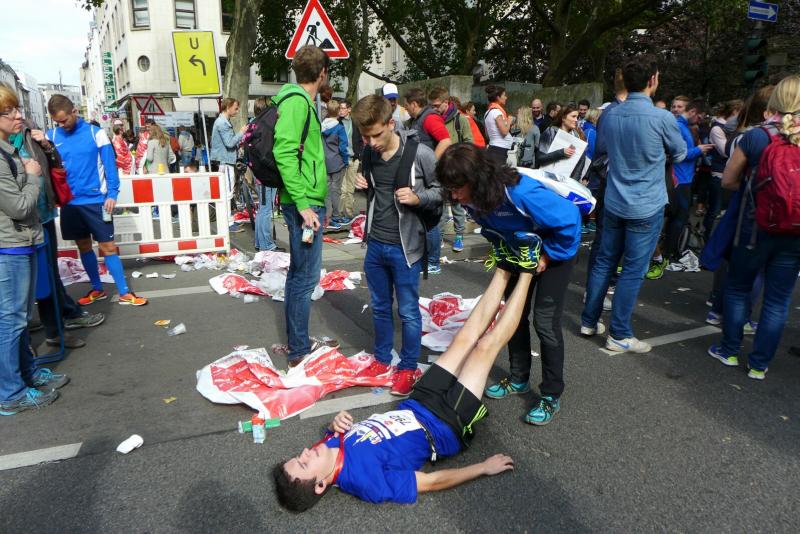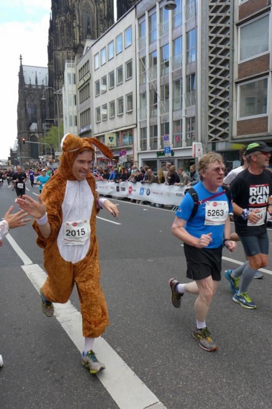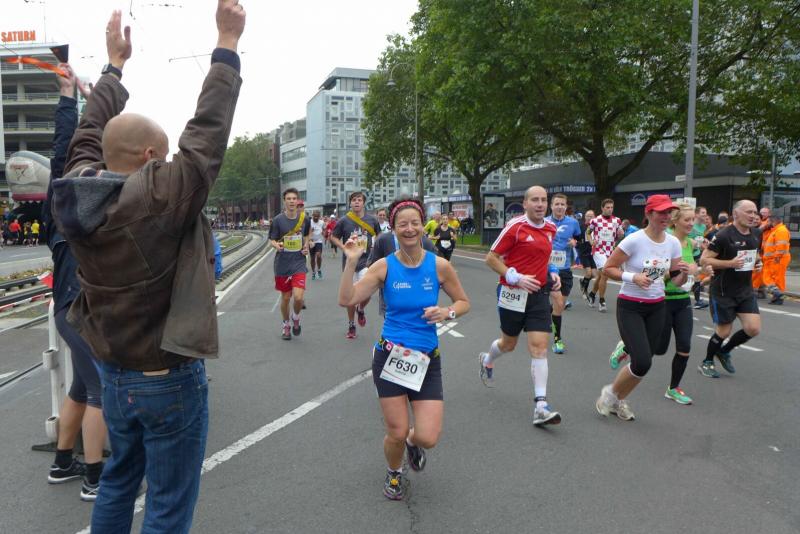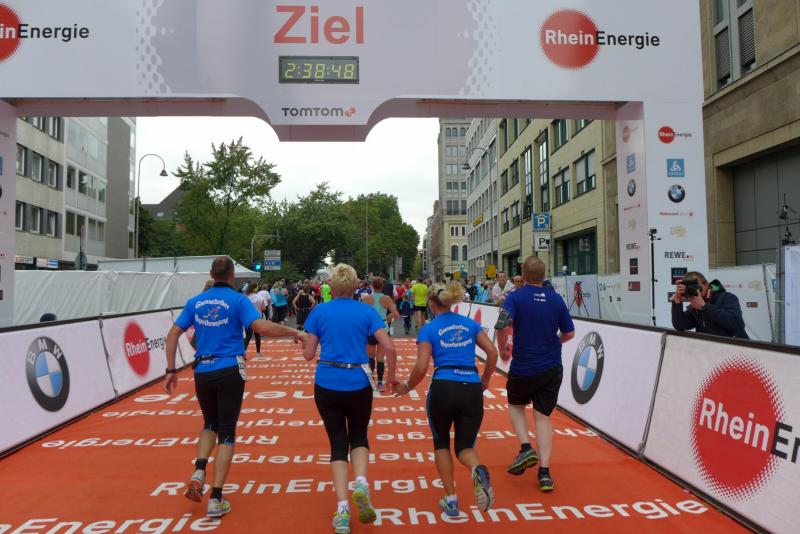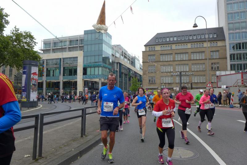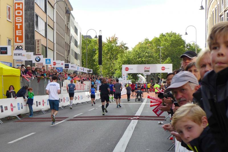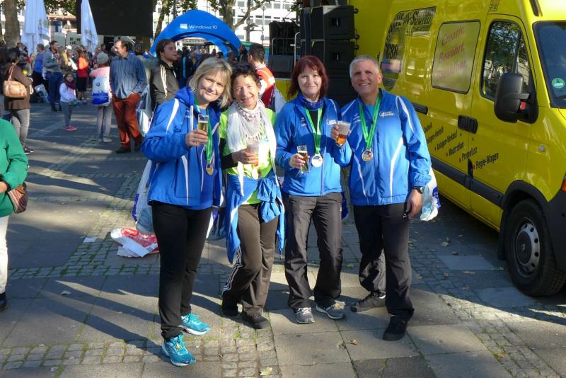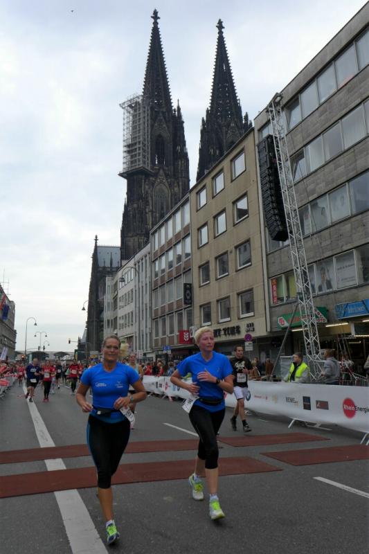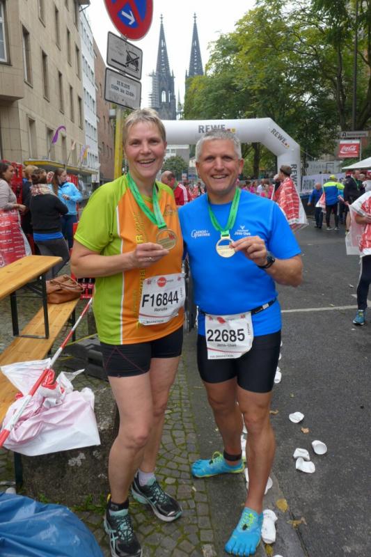 Unter den knapp 6000 Teilnehmern quälten sich auch Dirk Meier und Sabine Börner über die 42,195 Kilometer. Meier, der nach wie vor seinen Traum von 2:59 Stunden träumt, hatte sich entsprechend seinem Trainingszustand beim 3:15 Stunden Zeitläufer einsortiert. Mit angezogener Handbremse folgte er diesem Tempo bis Kilometer 35. Den Schmerz ausgeblendet, konnte er im letzten Drittel noch einen Gang zulegen. Börner hingegen schloss sich vorerst dem 4:00 Stunden Zeitläufer an. Aber bereits ab Kilometer neun musste sie abreißen lassen. Dies hatte sich schon bei den Tempoläufen im Training angekündigt. Als dann bei Kilometer 26 die Freunde an der Strecke standen, liefen erstmal dicke Kullertränen. „Bine, umkehren wäre jetzt aber auch blöd!“ Recht hatten sie und so weit hinten auf der Strecke offenbarte sich viel schlimmeres Elend. Vom hinkenden Läufer über krampfende Gestalten bis zum Totalausfall. Also dann lieber im Wohlfühltempo die Strecke genießen. Mit einem Stieleis in der Hand, reihte sich eine Läuferin wieder in den Trupp: "Sorry, ich muss mich hier irgendwie motivieren!" Gelächter in den Reihen, Applaus von den Zuschauern. Auf den letzten drei Kilometern durch die Kölner Innenstadt drängten sich die Zuschauer immer dichter und trugen die Aktiven förmlich in das Ziel. Der Dom war das Ziel, imposant empfing er alle Finisher.
