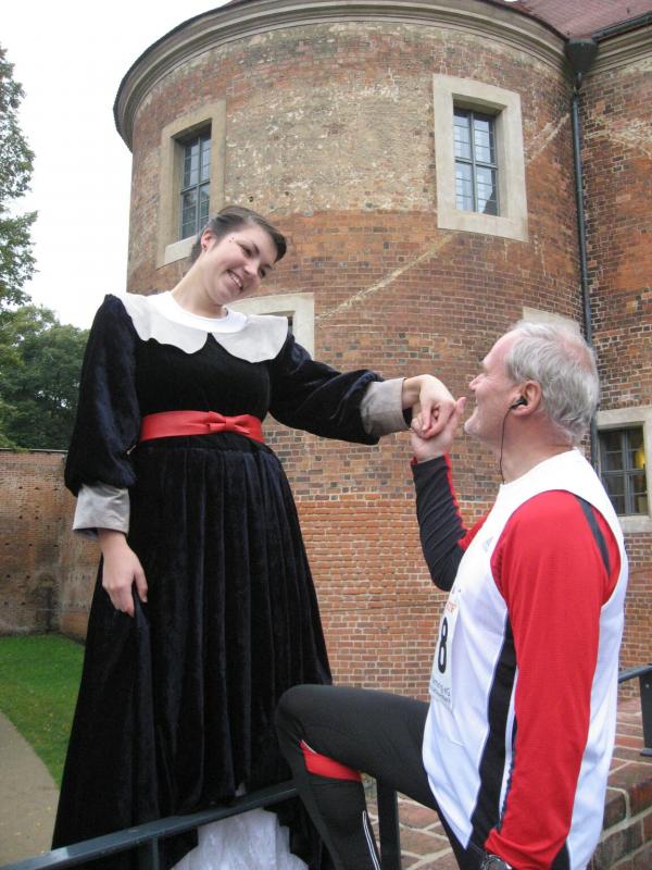 Als „Mutter aller Läufe“ unter Insidern benannt, zog sich am vergangenen Sonntag der Belziger Burgenlauf über 25 Kilometer durch die bunte Herbstlandschaft. Etwas länger als ein Halbmarathon und bergauf, bergab durch den Hohen Fläming, gingen acht Starter der Gaensefurther Sportbewegung diesen Crosslauf als letzte Vorbereitung für den Rügen-Brücken-Marathon an. Die Strecke war gut präpariert, hatte es doch am Vortag ordentlich geregnet. Und noch beim traditionellen Ehrenstart auf Burg Eisenhardt, drohten dunkle Regenwolken. Doch der guten Stimmung in dem großen Starterfeld machte dies keinen Abbruch. Bei angenehmen 12 Grad Celsius und leichtem Nieselregen ging es zusammen mit den acht Kilometerläufern auf die Strecke. Vom historischen Belziger Marktplatz mit seinen ca. 100 Höhenmetern über NN, kämpfte man sich nun allmählich bis auf 190 Meter hoch. Nur mit erhöhter Aufmerksamkeit und gegenseitiger Rücksichtnahme bewältigten die Sportler Stein- und Sandwege, Wurzelwerk oder durchnässte Grasnarben. Mitunter waren die Trampelpfade um die großen Pfützen für die hinteren Läufer nur noch gehend zu überqueren. Erleichterung für Renate Liedtke und Tina Börner, als sich die Acht-Kilometerstrecke vom restlichen Teilnehmerfeld trennte. Bevor es wieder bergauf ging, konnten sie sich auf der leicht abschüssigen Strecke erst einmal erholen. Nach nicht einmal einer Stunde erhielten sie bereits ihre Teilnehmerurkunden vom zuständigen Burgfräulein. Nun hieß es sich die Zeit zu vertreiben, bis die Langsteckler einlaufen.