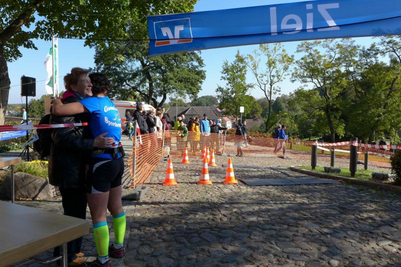 Während die beiden Gaensefurther über die 25-Kilometer-Distanz starteten, versuchte sich die Debütantin auf der acht Kilometer langen Wanderstrecke. Für die Börners ging es dank Rückenwind recht zügig bis nach Wiesenburg. Dafür wurde der Rückweg dann umso zugiger und die zwei Kilometer über offenes Feld waren kräftezehrend und nicht wirklich angenehm. Der dichte Wald versprach aber bald wieder Erholung und das ruppig urige Gelände war mit allen Reizen eines richtigen Crosslaufes gespickt. Genau das Richtige zum Auslaufen und Genießen nach dem Köln-Marathon vor einer Woche. Nach den letzten zwei Kilometern Asphalt galt es nur noch, den Anstieg zur Burg zu bewältigen und die Mutti im Ziel wiederzufinden. Doch da stand sie schon! Freudestrahlend mit der Teilnehmerurkunde in der Hand verkündete sie: „Nach meiner Runde Toffifee war ich in der Wandertruppe sofort integriert!“ Der Einsatz hatte sich gelohnt, Börner mit der leeren Schachtel - das Nachsehen…