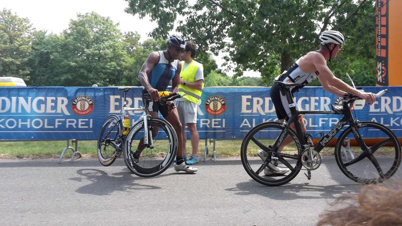 Vater Matthias hatte für sich die Olympische Distanz ausgesucht. Sie stand am Sonntag Vormittag auf dem Programm. 1550 m schwimmen, 42 km Radfahren und 10 km laufen waren für ihn angesagt. In einer Zeit von 2:24:36 Stunden überquerte er die Ziellinie, was in Altersklasse MK40 der 13. Rang war.