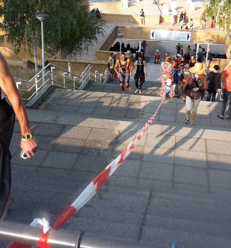 Als der letzte Schwimmer aus dem Wasser kam wurden die Kinder in 3 Wellen gestartet. Finn war in der ersten Gruppe vom Mini Man Schüler C. Es starteten 21 Schüler mit ihm. Es war ein Swim & Run Wettkampf mit 100 m schwimmen und 500 m laufen. Finn kam als 5. aus dem Wasser, wurde gesamt 7. und 5. Junge. Es hat ihm großen Spaß gemacht, auch wenn er vor der Treppe großen Respekt hatte. Bis auf einige Stufen war er durchgehend laufend unterwegs, was nicht mal den Erwachsenen gelang. Am meisten freute er sich über die gute Schwimmposition. Es war sein erster Wettkampf, den er durchgekrault hat. Glücklich im Ziel angekommen, begab er sich dann mit seiner Mutter an die Radstrecke, um den Papa anzufeuern. Für den nächsten Berlin Man in 2 Jahren haben die Lampes vor, sich alle 3 wieder anzumelden.