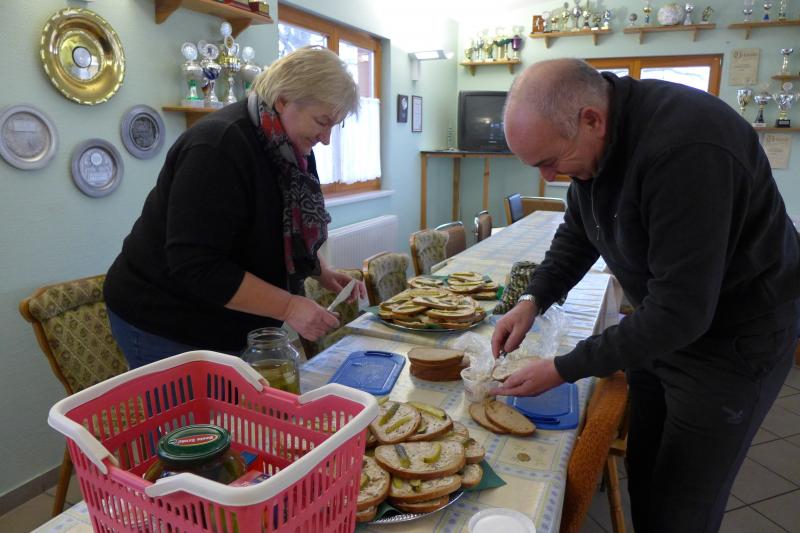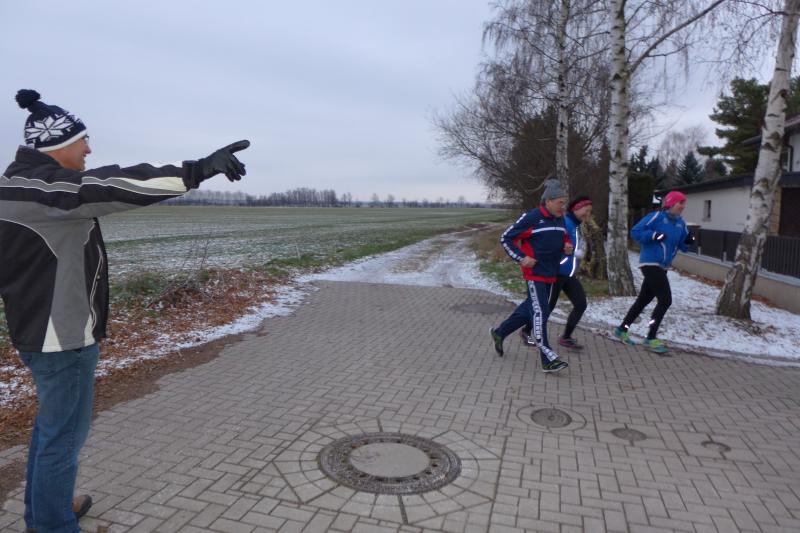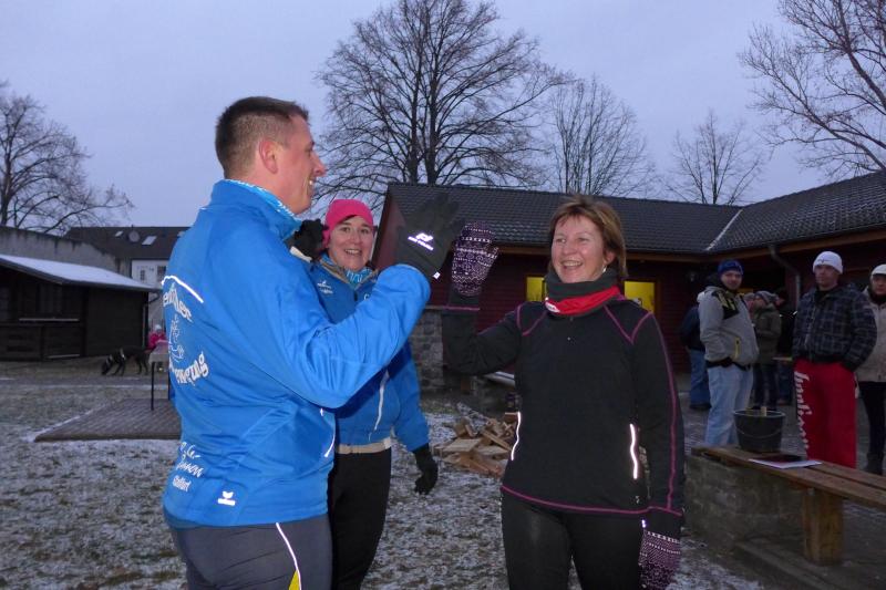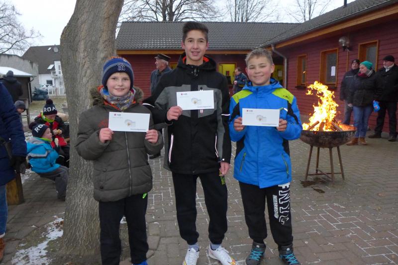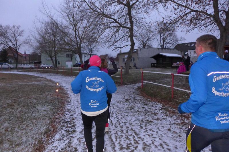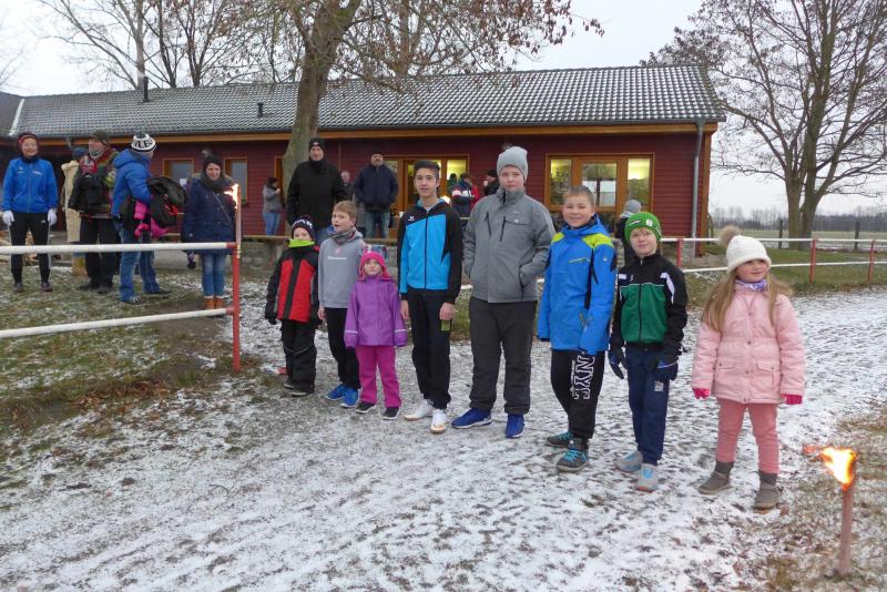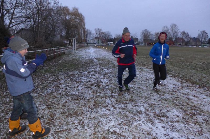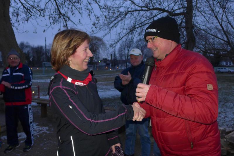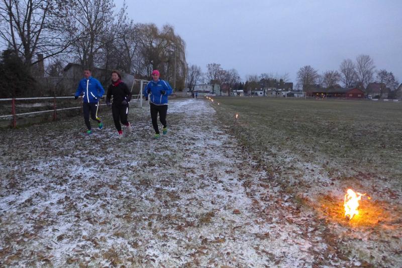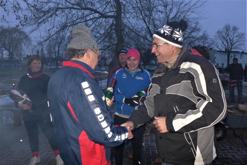 Für ihn ist wichtig, dass die Tradition gepflegt wird. Und dazu gehört eben auch dieser Lauf. Noch wichtiger als Punkte und Platzierungen sind für Krokotsch, dass die Geselligkeit in seinem Verein aufrecht erhalten wird. Dieses Zusammenkommen um die Jahreswende gehört einfach zum Vereinsleben. Und dafür hatten sich die aktiven Sportfreunde wieder mächtig ins Zeug gelegt, schmierten Fettstullen, feuerten den Grill an. Für die Kinder entzündeten Danny Glockenmeier und Philipp Herning Fackeln um den Sportplatz. Nach zwei Runden konnten sich die schnellsten drei – Leon Tangermann, Jonas Stelter und Conner Tangermann – über Gutscheine fürs Erlebnisbad im Salzlandcenter Staßfurt freuen. Alle kleinen Teilnehmer erhielten noch Überraschungseier, natürlich auch die Zwillinge Frieda und Friedrich, die zur Erwärmung sogar eine Runde vor dem eigentlichen Rennen rannten. Die Erwachsenen mussten ein paar Meter mehr durch die Feldflur absolvieren, bevor die Besten ihre Trophäen in Form von Karpfen und flüssigen „Spaßmachern“ in Empfang nehmen konnten. Bei den Frauen war das Andrea Frey, bei den Männern Nico Mahler und als ältester Teilnehmer Peter „Schacki“ Muster.