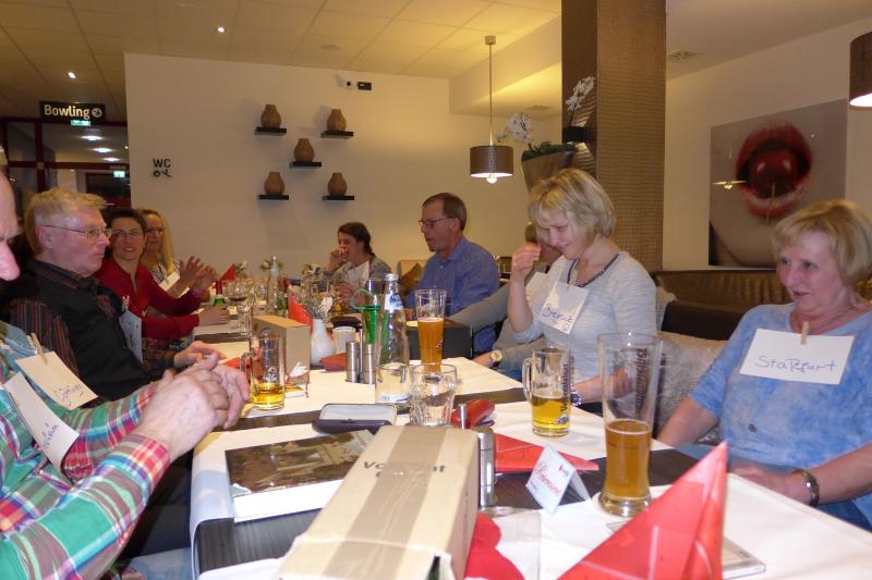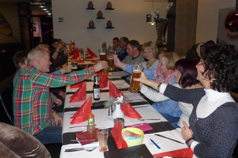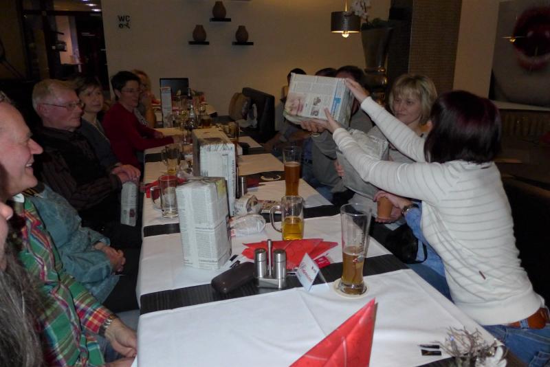 Die üppigen Weihnachtsessen waren inzwischen verdaut und ein Blick auf den druckfrischen Wettkampfkalender verriet Platz an diesem kalten Februarwochenende. So verabredeten sich die Bode-Runners der Gaensefurther Sportbewegung für ihre diesjährige Feierlichkeit im Staßfurter Salzlandcenter. Mal ganz ohne sportliche Betätigung war nur Schlemmen vom Buffet und gemütliches Beisammensein vorgesehen. Eine Fotoauswahl vom zurückliegenden Wettkampfjahr, brachte dann so manch vergessenes Erlebnis schnell wieder in Erinnerung. Nach einem weiteren Bierchen wechselten die mitgebrachten Schrottwichtelpakete amüsant ihre Besitzer. Wohl vorausahnend, dass alle neuen Mitglieder eine „Aufnahmeprüfung“ im Kreise der Runners erwartet, hatten kurioser Weise alle vier Neuzugänge eine andere Verpflichtung an diesem Abend. So blieben die alten Bodis unter sich und testeten in einem weiteren Tischspiel ihre bevorstehende Zugfahrt zum Drei-Länder-Marathon nach Bregenz. Das Ergebnis fiel eindeutig aus - ganze vier Umstiege und über neun Stunden Fahrzeit sind einfach zu anstrengend vor einem Marathon, da müssen dann wohl die Autos ran.