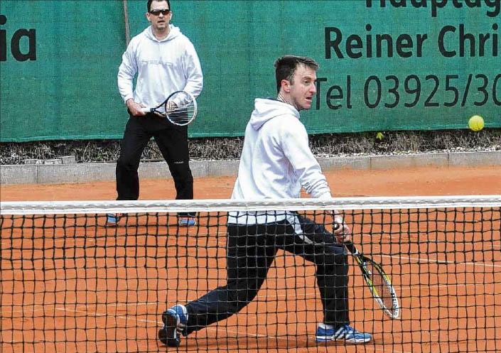 Die Tennis-Spieler der Gaensefurther Sportbewegung sind am Sonnabend in die neue Saison gestartet. Im ersten Spiel der Herren 40 Harz in der Bereichsliga holte die GSB zu Hause gegen den Hessener SV einen 4:2-Erfolg, der erst nach dem Doppelerfolg von Ronny Selig (r.) und Michael Busse ganz am Ende feststand. Mit 6:2 und 7:5 hatten Busse/Selig das gegnerische Doppel Axel Lange und Thomas Hohmann bezwungen. Die Einzelrunde hatten die Gaensefurther durch Siege von Selig, Busse und Ulf Gothe mit 3:1 klar für sich entschieden.