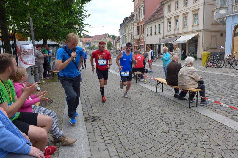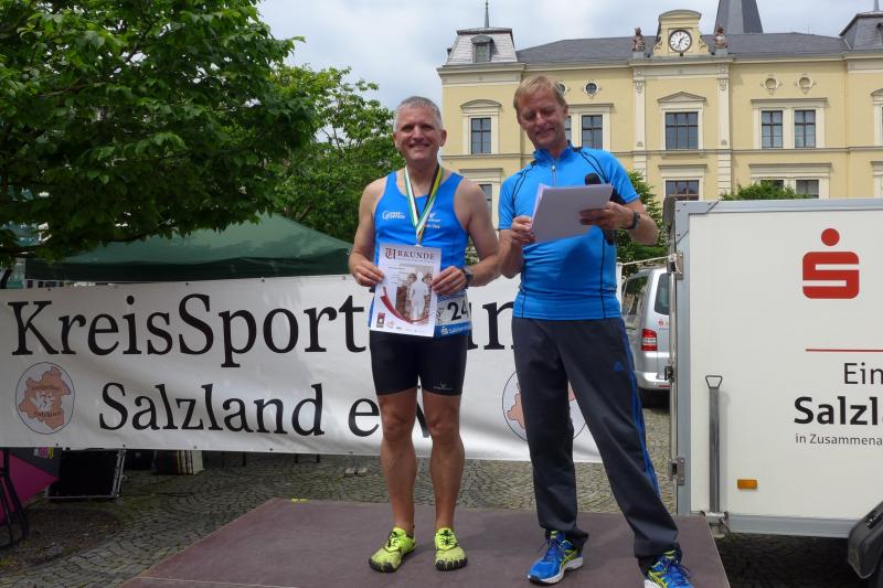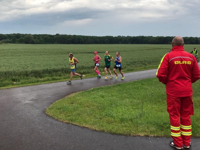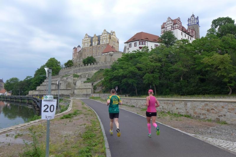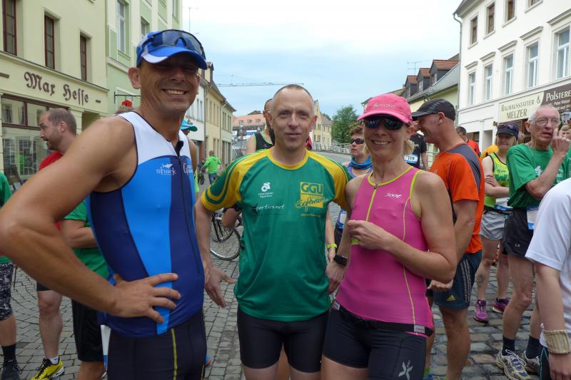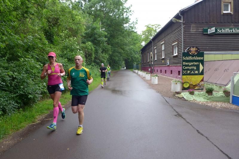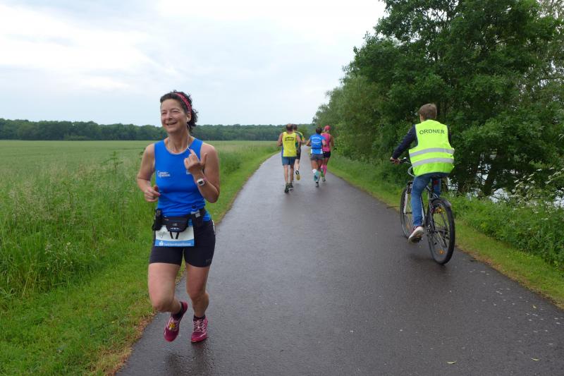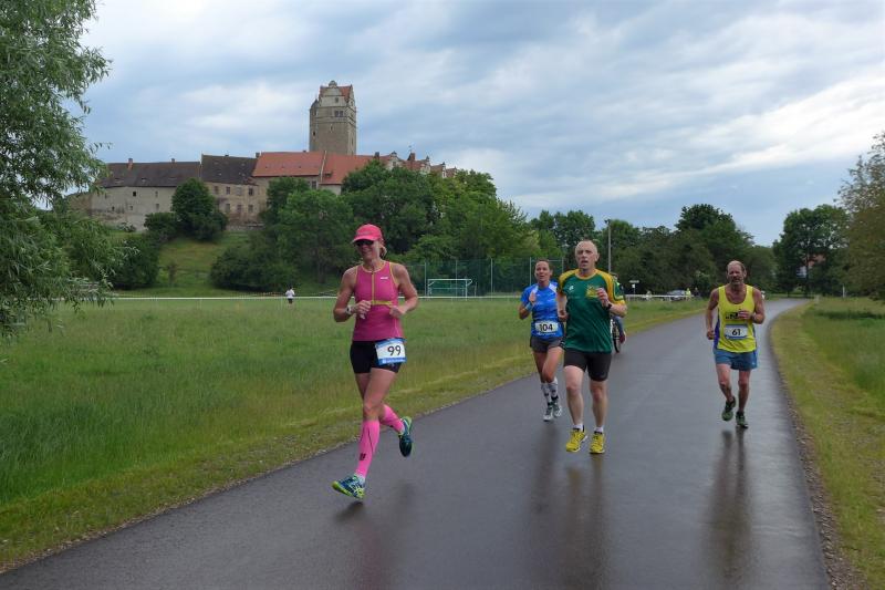 Heidi Rabenstein von der Gaensefurther Sportbewegung wollte diese Herausforderung zusammen mit ihrem Mann Ronald angehen. Mit allen guten Wünschen der Vereinskollegen erfolgte der Startschuss zusammen mit 130 Teilnehmern auf dem Alten Markt in Bernburg. Die Regenwolken hatten sich bereits vor dem Start ordentlich entleert und sollten die Aktiven noch fast über die gesamte Streckenlänge begleiten. Es ging am Bernburger Tiergarten vorbei, immer der Saale durch das dichte Grün folgend, bis in den Auwald nach Plötzkau. Auf dem Sportplatz eröffneten die Streckenposten den Läufern, dass doch bitte zwei Runden zu laufen seien. Was für ein Spaß durch das nasse Gras, spätestens jetzt waren auch die Strümpfe nass. Das erhabene Schloss grüßte vom Schlossberg und wachte über die Einhaltung der Rundenzahlen: „Hey Silvio, zurück! Zwei Runden musst du hier!“ ermahnte Jens-Uwe Börner seinen Kontrahenten vom BSV Eickendorf und verwies ihn in Runde zwei durch das nasse Gras. Börner verlor auch die Spitzengruppe der Frauen nie aus den Augen und erlebte den Zweikampf zwischen Ina Schöler (ZLG Atzendorf) und Stefanie Nowak von der Gaensefurther Sportbewegung direkt mit. Zurück in Gröna, musste Nowak nach der Saaleüberquerung dann abreißen lassen. Am anderen Flussufer ging es zurück nach Bernburg. Schöler meisterte ihren ersten Lauf in diesem Jahr mit Bravour und meldete sich mit dem Gesamtsieg bei den Frauen in beeindruckender Wettkampfform zurück. Bei den Männern holte sich Toni Keller in nur 01:18:05 den Pott über den Gesamtsieg. Im vereinsinternen Duell der Triathleten war Maik Löwe am laufstärksten, gefolgt von Stefan Berger und Steffen Schöler, die mit ihren Zeiten mehr als fit sind für die laufende Triathlonsaison. Sein wachsames Auge und die Pace mit den schnellsten Frauen des Laufes, verhalfen am Ende auch einem überglücklichen Börner auf das Podest. Kathleen Mahler finishte nach dem Rennsteig zufrieden ihren zweiten Halbmarathon und ihr Mann Nico reformierte quasi seine Bestzeit über diese Distanz um ganze zehn Minuten. Sabine Börner freute nach dem absolvierten Ultra, dass die Beine auch noch einen schnellen Lauf hinbekamen.