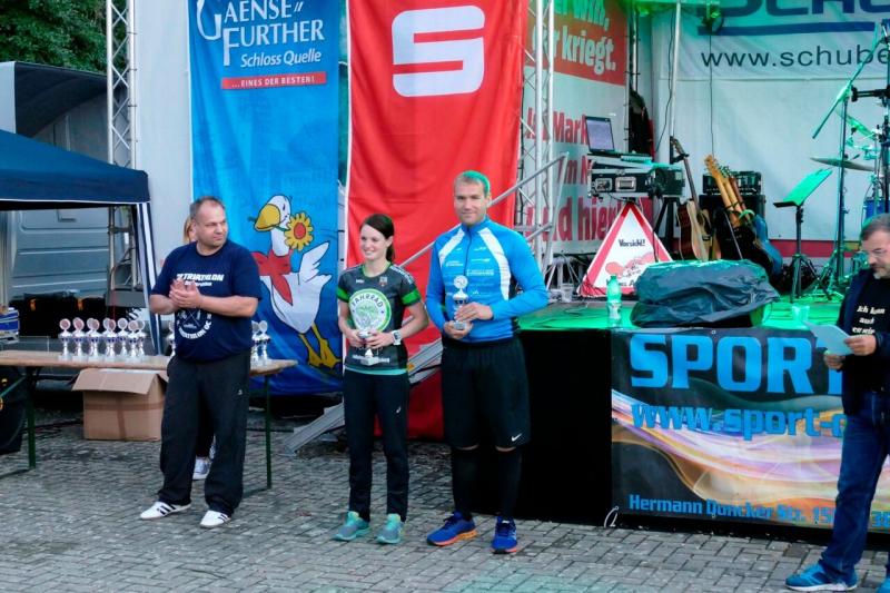 Olaf Moch (1:33:20h) und Kirsten Geist (2:03:09h) (beide AK50) komplettierten den Erfolg der Gaensefurther mit Platz 3 und 2. Alle genossen die Siegerehrung mit abschließendem Feuerwerk. Ganz sicher werden 2018 wieder einige Gaensefurther bei diesem gut organisierten Triathlon mit super interessiertem Publikum starten.