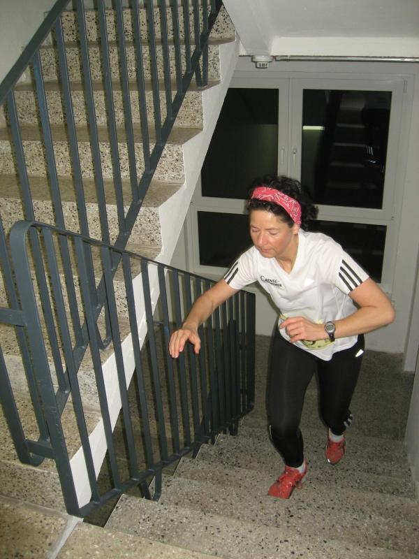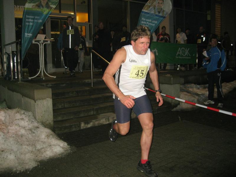Jeder Sportler startet nach Eingabe seiner Startnummer in den PC für sich allein. „Fünf, vier, drei, zwei, eins - los!“ Die Entertaste bestätigt, Florian Börner mit der Startnummer 36 ist unterwegs. Nun beginnt der Wettlauf gegen die Uhr. Seit 2002 liegt der Streckenrekord über 232 Stufen bis in die 14. Etage bei 57,8 Sekunden. Nach 60 Metern Anlauf kommen die ersten acht Stufen vor dem Eingang in den Campus-Tower. Im Uhrzeigersinn geht es nun von Etage zu Etage, immer möglichst drei Stufen mit einmal. Weit am Geländer nach oben gegriffen, zieht sich Florian auf die nächste Treppe. In großen Ziffern steht die Geschosszahl an den Etagenausgängen. „Nur nicht hinsehen, jetzt noch nicht!“ Es läuft gut, die Kräfte richtig einteilen und tief Luft holen. Die Beine werden schwerer, aber mit der linken Hand auf dem Oberschenkel nachdrücken, das hilft beim Schwung holen. Die elfte Etage ist erreicht, die Lunge brennt von den tiefen Atemzügen aber die Beine spielen noch mit. Endlich kommt die 14, also noch 16 Stufen bis zum Ausgang. Ein kurzer Flur noch bis zur Ziellinie und alles life im Internet: „Guten Abend Magdeburg!“ Geschafft versinken die ankommenden Läufer im engen Flur vor der Fahrstuhltür. Sanitäter begutachten die nach Luft schnappenden Sportler und reichen Getränke. Florian Börner vom cash´n fun Junior Team der Salzlandsparkasse benötigte 64 Sekunden für seinen Hochhaustrip, am Ende ein glücklicher Platz in der Top-Ten-Wertung. Vater Jens-Uwe Börner, welcher etwas mehr Winterspeck in die 14. Etage schleppen musste, beendete als 79. diesen Lauf. Zum ersten Mal dabei, absolvierte Christoph Lampe von der ZLG Atzendorf tief beeindruckt und fasziniert, sein Debüt auf Platz 95. Bei den Frauen ein starkes Teilnehmerfeld. 19 Mädels waren bereits beim Kinderlauf gestartet, 34 Damen folgten nun beim Hauptlauf. Von den Bode-Runners der Gaensefurther Sportbewegung kam Annegret Wille am schnellsten nach oben (2. Pl. Altersklasse ab 35). Dicht gefolgt von Andrea Krukowski (3. Pl. AK ab 35) und Sabine Börner. Oben angekommen vermisste man in diesem Jahr die frische Luft und die tolle Aussicht auf das nächtliche Magdeburg, welche das kleine Flurfenster einfach nicht hergab. „Nun gut, aber runter nehmen wir jetzt den Fahrstuhl!“