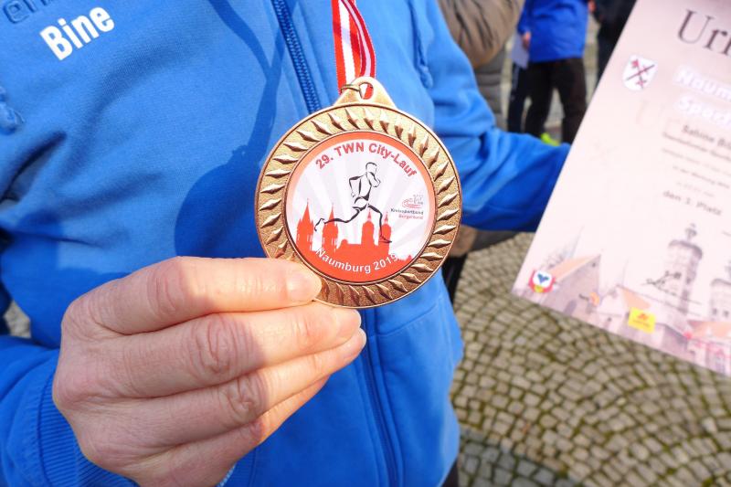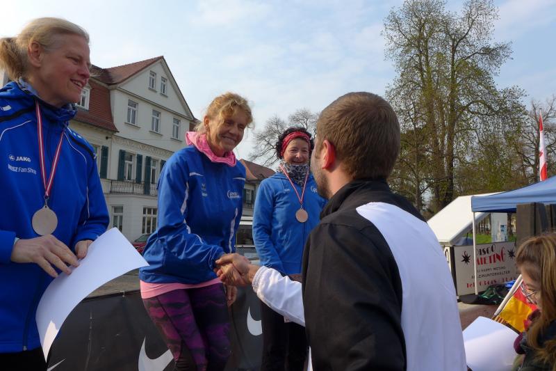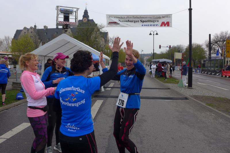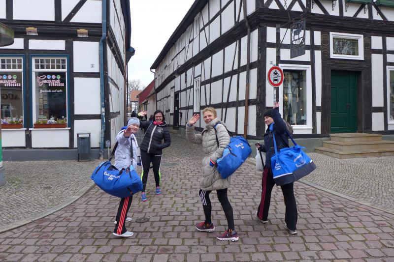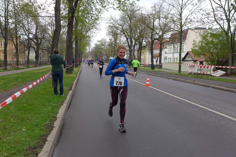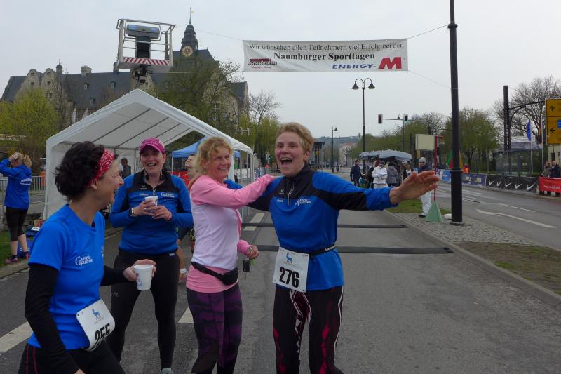 Beim City-Lauf Naumburg war wirklich die Creme de la Creme der Laufelite vertreten, denn dieser Wettkampf wurde zugleich als Landesmeisterschaft im Straßenlauf und als Deutsche Gehermeisterschaft ausgetragen. Nachdem die Geher vormittags noch im Schneegestöber unterwegs waren, hatte sich die Wetterlage zum Zehn-Kilometer-Start der Gaensefurther etwas entspannt. Der Nieselregen und die kühlen Temperaturen kamen den schnellen Sprints auf der Straße sehr entgegen. Nun mussten genau zehn Runden zurückgelegt werden. Mit den Meisterschaften hatten die Gaensefurther nichts zu tun, denn nur Startpassinhaber gingen in diese Wertung ein. Der Kreisverkehr am Marienring war gut zu laufen und den Konkurrenten konnte man prima in die Augen sehen. Dagegen war die spitze 360-Grad-Wende am Theaterplatz nach weiteren 500 Metern eine echte Herausforderung. Der Asphalt war rutschig und nass, so dass das Lauftempo an dieser Passage drastisch reduziert werden musste. Und wieder anlaufen, vorbei am Sprecher und den zahlreichen Helfern die die Runden zählten, bevor der nächste Kilometer angegangen wurde. Ein guter Testlauf für die sechs teilnehmenden Bode-Runners, die sich im starken Feld der Profiläufer nicht lumpen ließen. Nur aus dem Ziel, ein paar Körner für den Wettkampf am nächsten Tag aufzuheben, wurde leider nichts. Zu groß war der Reiz alles zu geben, so dass die Runners am Ende doch wieder schweißgebadet im Ziel landeten. Der guten Stimmung tat dies kein Abbruch, denn der Moderator und DJ hatte für jeden Finisher neben treffenden Sprüchen meist noch ein musikalisches Intermezzo auf Lager. Als Renate Liedtke dann mit dem Refrain „Volle Granate, Renate, Renate, Renate, Renate“ empfangen wurde, war das schon wie eine kleine Siegerehrung. Diese feierte sie im Anschluss, ebenso wie Kirsten Geist, auf Platz eins in ihrer Altersklasse.