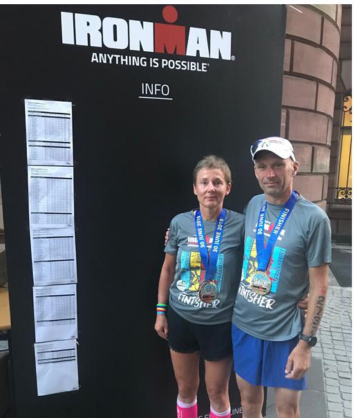 Abschließend dann das „Anstrengendste“. Beide sind eigentlich sehr gute Läufer, aber bei fast 50°C auf dem Asphalt und nach dem schon großen Tagespensum, war das der schlimmste Teil. Durch eine Streckenänderung wurde zwar schon mehr Schatten geschaffen, aber ein Großteil war in der prallen Sonne am Mainufer zu absolvieren. Man freute sich schon immer auf die nächste Verpflegungsstelle alle 2km: Eis, Schwämme, Cola, Wasser.... Die Pausen musste man sich gönnen, daher auch die recht langsamen Laufzeiten über die über 40km. Stefanie musste ab Kilometer 15 mit Blasen kämpfen wegen der durchnässten Schuhe. Stefan kam trotz reduzierten Lauftrainings besser durch als erwartet. Zufällig trafen sich beide an der letzten Wendeschleife und konnten so gemeinsam Hand in Hand ins Ziel laufen.(Laufzeit Stefan 4:37h und Stefanie 5:01h) Das war am Ende doch ein schöner Abschluss. Stefanie belegte Platz 10 und Stefan Platz 145 in ihren Altersklassen (beide AK50) mit einer Gesamtzeit von 13:14 Stunden. Bei knapp einem Drittel Aussteigern oder Nichtstartern war man am Ende über den gewonnenen Kampf mit der Hitze zufrieden und weniger kritisch mit den Zeiten.