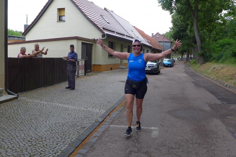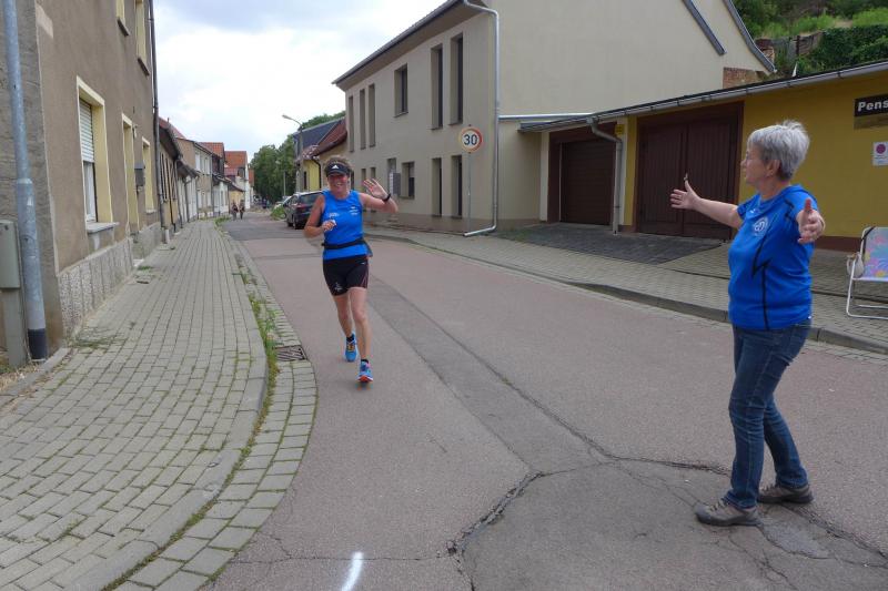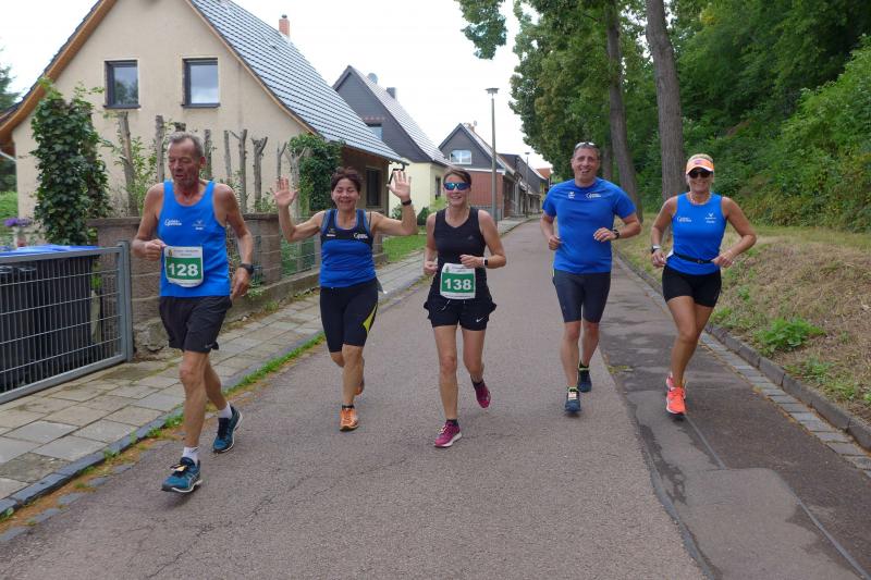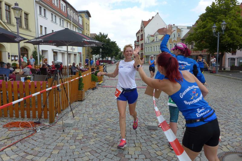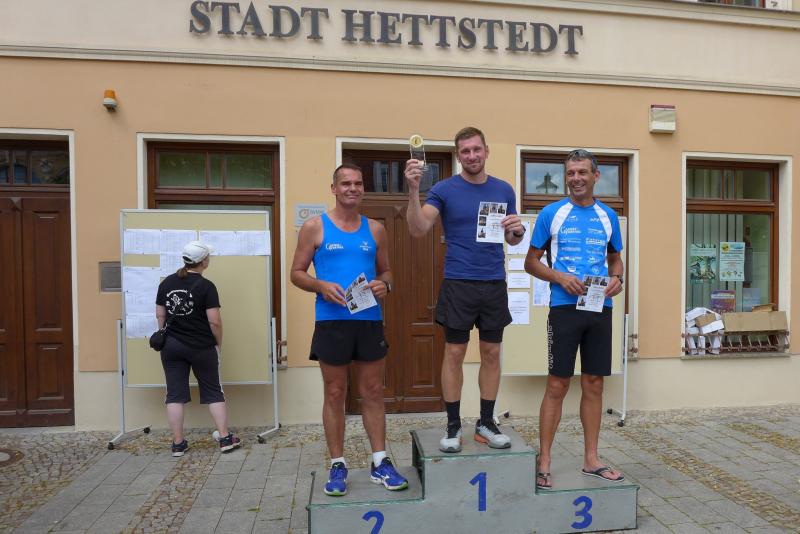 Über die Halbmarathondistanz bei den Männern blieb der Pokal in Hettstedt. Mario Brand siegte in 1:25:16 Stunden, Dirk Meier sicherte sich Platz zwei in der Gesamtwertung vor Vereinskamerad Steffen Schöler, der auch sicher noch die olympische Triathlondistanz vom Vortag in den Beinen hatte. Einzige Gaensefurther Teilnehmerin die sich dreimal über den Jägerberg quälte, war Kirsten Geist. Sehnlichst von den Runners auf dem Markplatz erwartet, lief sie auf Gesamtplatz zwei ein.