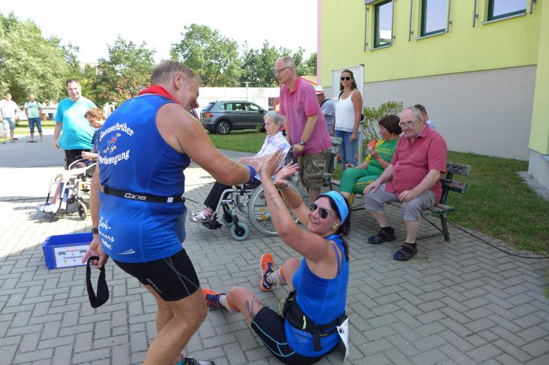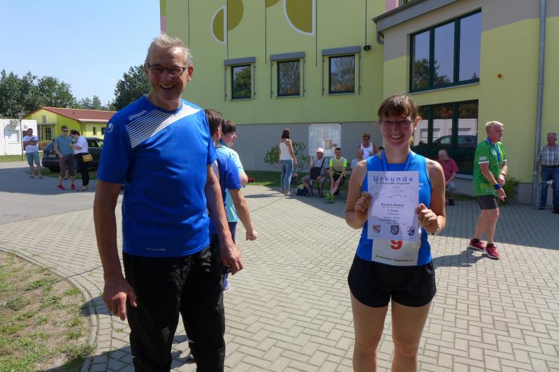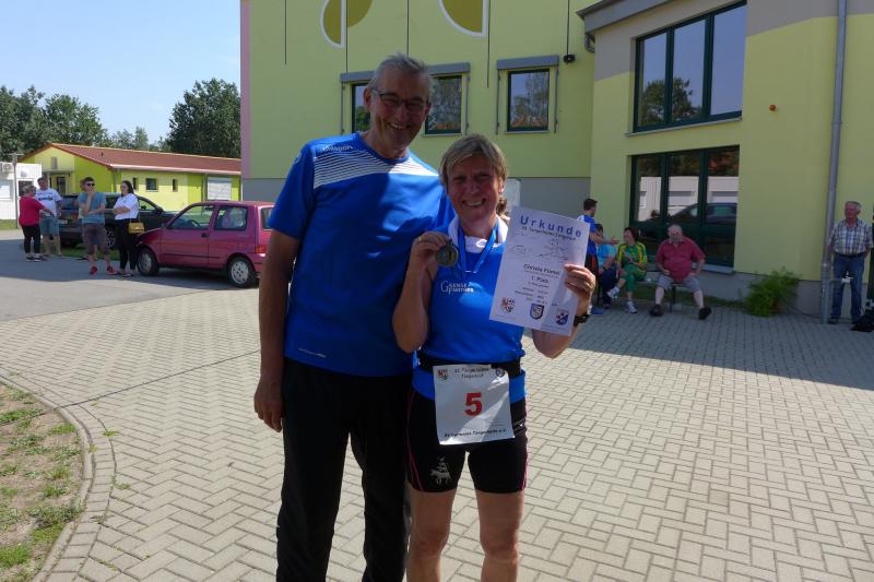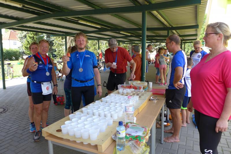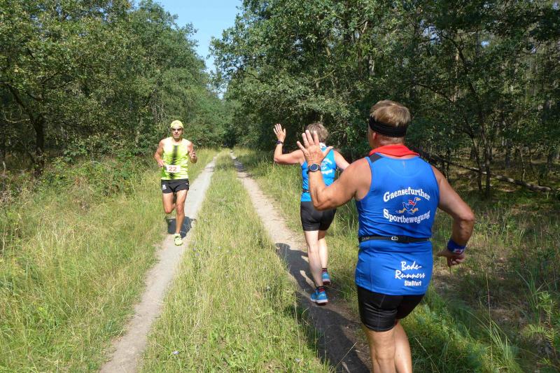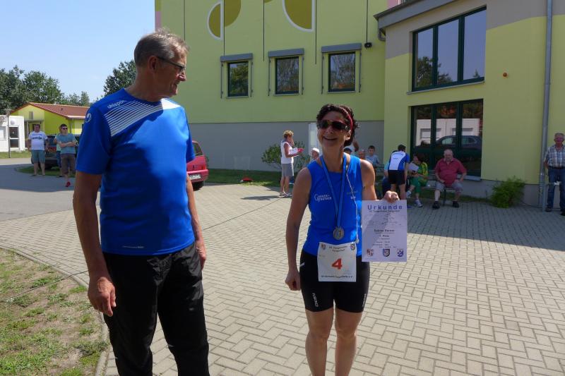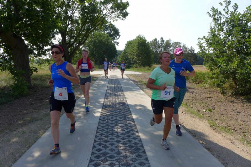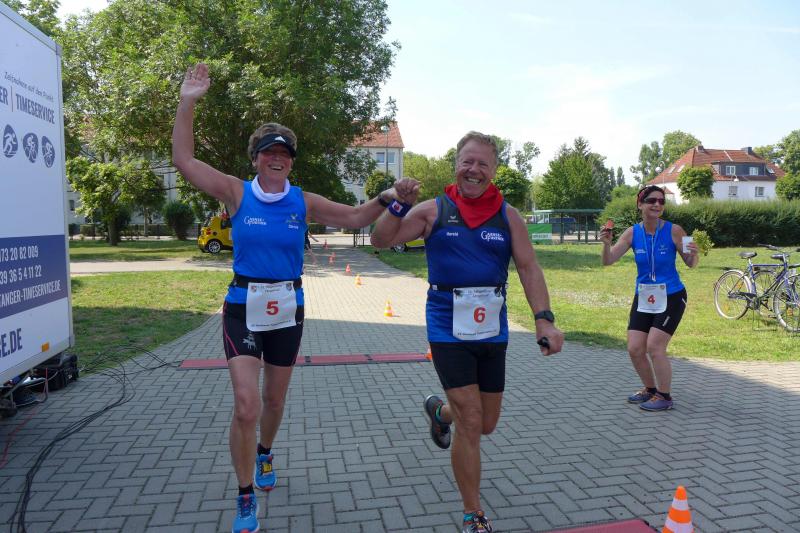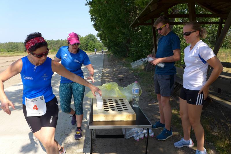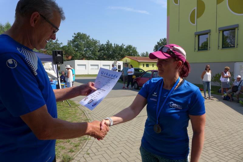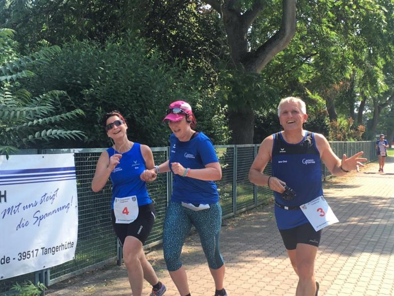 Während Kathleen Mahler und Börners nach dem Salzlandsparkassen-Triathlon vom Vortag nur auslaufen wollten, versprach Harald Fümel seiner Ehefrau Christa ein gemeinsames, ruhiges Sonntagsläufchen. Also ging der Auftrag, ein schnelles Rennen für die Bode-Runners abzuliefern, an Sandra Zelmer. Nach dem Radweg bis Briest führte die Laufstrecke durch den Tangerhütter Wald, in dem die Temperaturen etwas angenehmer waren. Die zusätzlichen Wasserstellen wurden gut angenommen und am Verpflegungspunkt der Tangerbrücke war dann auch schon die Wendemarke für den 6,5-Kilometer-Kurs erreicht. Zelmer musste noch weiter, bis ein Streckenposten den Wendepunkt der Neun-Kilometer-Strecke markierte. Die Sportlerin setzte den Auftrag sehr engagiert um und holte sich nach dem Zieldurchlauf prompt den Gesamtsieg bei den Frauen. Zeitgleich und eigentlich viel schneller als geplant, liefen Mahler und Börner auf Gesamtplatz 2 der Frauen ein. Während anlässlich der Jubiläumsausgabe noch einige Präsente an verdiente Sportfreunde des Tangerlaufs gingen, feierte auf Grund der geringen Teilnehmerzahl fast jeder Finisher einen Podestplatz. „Von wegen Auslaufen!“, scherzten und freuten sich die Sportfreunde unter der wohltuenden Dusche über ihre Platzierungen.
