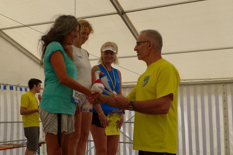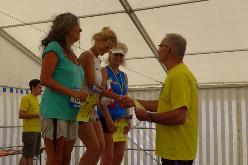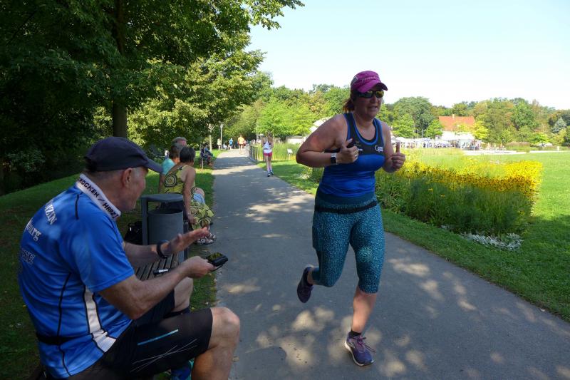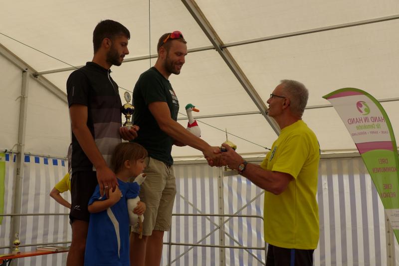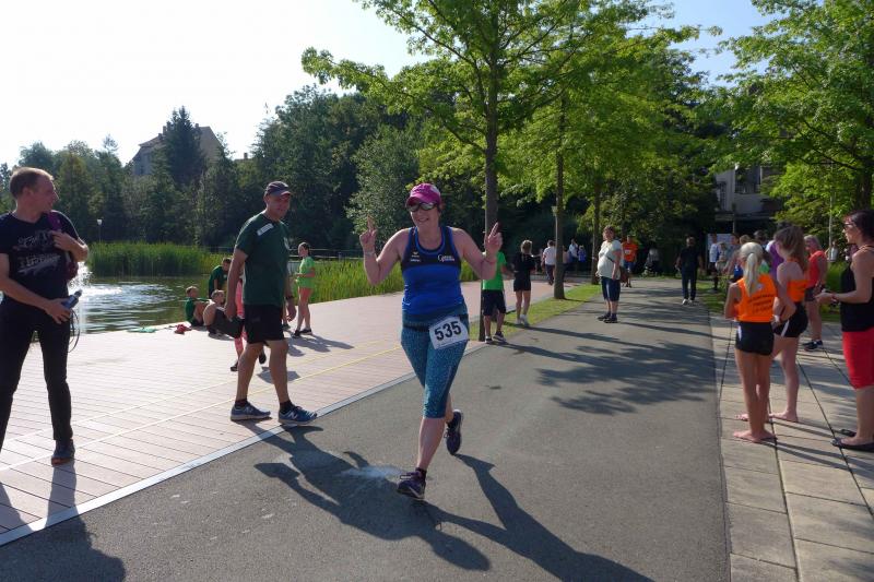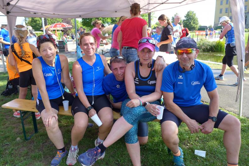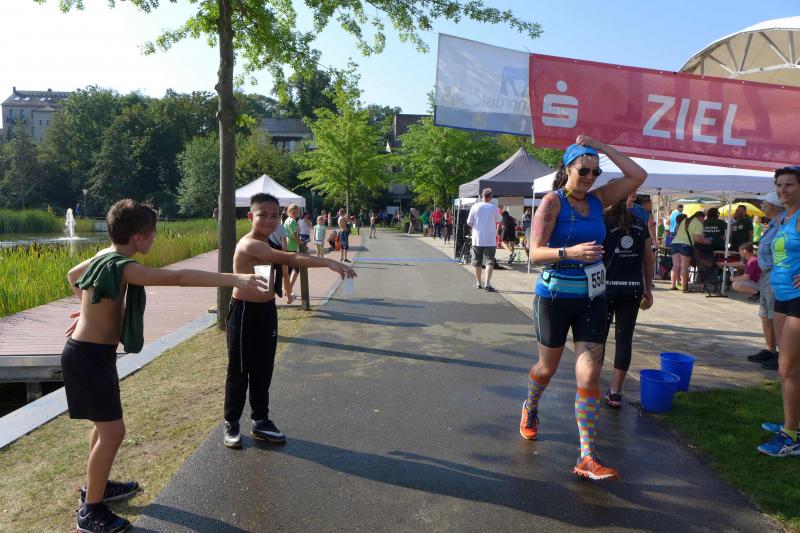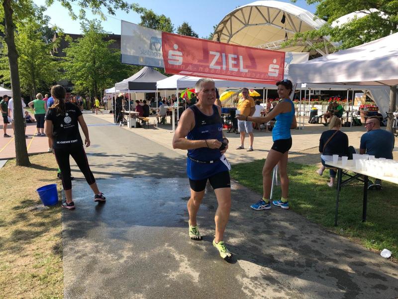 Ausgeruht und komplett auf ihre Heimstrecke konzentriert, finishte Petra Becker die Neun-Kilometer-Distanz auf Platz drei in ihrer Altersklasse W50. Sandra Zelmer lief nach einer kurzen Auszeit sogar auf Platz eins in der W30, gefolgt von Janine Wuwer (Platz zwei W35). Kathleen Mahler siegte in der W40 vor Nancy Bothe, die sich im Ziel wahnsinnig über ihre schnelle Zielzeit freute, und in der W50 standen auf dem Podest ausnahmslos Gaensefurther Füße. In der männlichen Jugend U14 lief Marc Krüger ein beherztes Rennen über lange neun Kilometer und brachte die Strecke noch unter 53 Minuten über die Ziellinie. Hautnah konnte er den Zieleinlauf der ersten Läufer über die 13-Kilometer-Distanz mitverfolgen. Scheinbar fliegend überholte Triathlet Maik Löwe, gefolgt von Neuzugang Rinaldo Schielke, der trotz abfallender Strecke und Rückenwind den Vorauseilenden nicht mehr einholen konnte. Keine Chance, schmunzelte Löwe im Ziel, ist er doch in der Form seines Lebens: „Barcelona wartet in vier Wochen auf mich und Ziel ist die Qualifikation für den Ironman Hawaii 2020!“