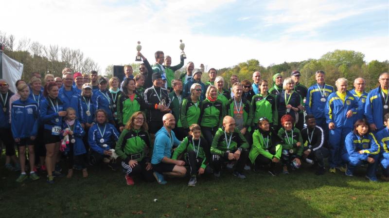 Nach Dusche, Kaffee und einer nicht leichten Entscheidung am üppigen Kuchenbuffet, folgte die umfangreiche Siegerehrung. Marc Schwärzel hatte Zeitmessung und Ergebnislisten im Griff und nach den Ehrungen des Wettkampfes stand auch schnell die Cup-Auswertung fest. Zur Jubiläumsveranstaltung gab es extra große Glaspokale für die ersten Plätze und Medaillen für alle Platzierten. „Die Siegerehrung dauert ja länger als der Lauf!“, stellte Moderator Dreisbach fest und krönte die Cupsieger mit den grünen Laufjacken noch in der Mannschaftswertung. Im nächsten Jahr würden gerne mal die Blauen die riesige Sektflasche knallen lassen.
