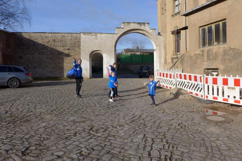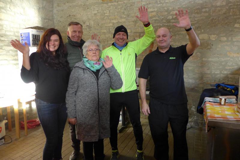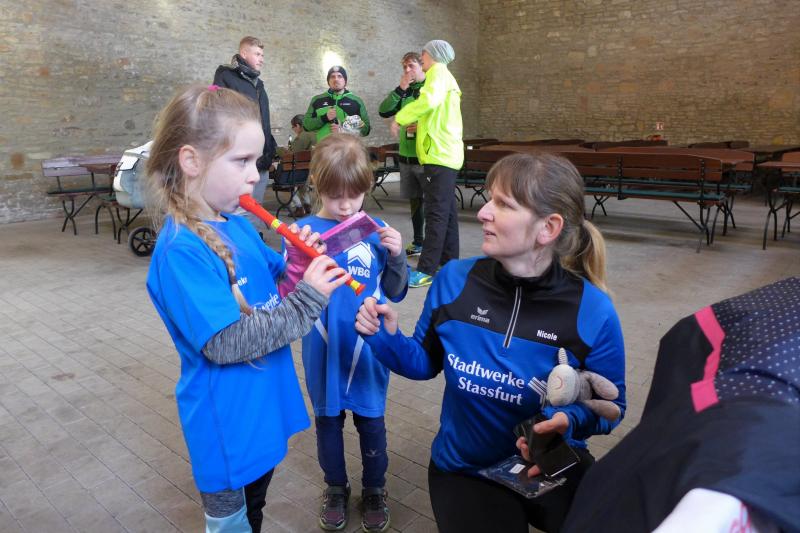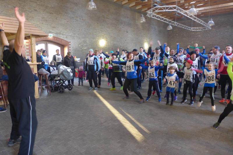 Das ließ er sich nicht nehmen! Der Aderstedter Bürgermeister Mike Franzelius bestand vor dem Start des Neujahrlaufes auf „sein“ Gruppenbild mit allen Teilnehmern. Den Wunsch erfüllten die 79 Starter natürlich gerne und reihten sich vor der Festscheune diszipliniert auf. Ungeachtet aller Vorbereitungen die so eine Laufveranstaltung mit sich bringt, hatte Franzelius bereits die fünfminütige Erwärmung gestemmt und die Ungeduldigen somit auf Betriebstemperatur gebracht. Bei angenehmen Lauftemperaturen standen dann alle Starter über eins und sechs Kilometer zappelig an der Startlinie. „Die Kinder laufen ihren Kilometer links, dann links und nochmal links!“, so der Bürgermeister, der sich auch für den erlösenden Startschuss bereitgestellt hatte. Los ging es, und noch mit den gesprochenen Worten im Ohr, liefen die Knirpse nach dem zweiten Links auch gleich das dritte Links, ohne den weisenden Streckenposten je gesehen zu haben und kürzten somit die Runde ab. Nur zwei Insider liefen wirklich einen Kilometer und kamen etwas verdutzt und ohne Verfolger ins Ziel. Die Aufregung war aber schnell vergessen, denn am Ende gab es für alle Kinder nicht nur eine Medaille, auch ein kleines Präsent durfte jeder mit nach Hause nehmen.