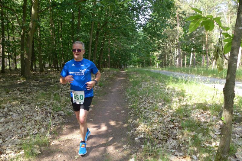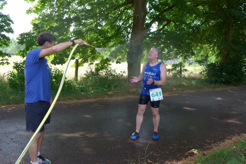 So ging es am vergangenen Wochenende neben einer Sechs- und einer Zehn-Kilometer-Wertung auch auf die Walkingstrecke, denn die Ihleläufer aus Burg hatten im Rahmen des Elbe-Ohre-Cups zum Bismarckturmlauf eingeladen. Vom PSV Sportplatz aus, lag die Stadt bald hinter den Startern und im dicht bewaldeten Bürgerholz, war der Stadionsprecher bald nicht mehr zu hören. Dafür surrten zahlreiche Mücken um die Läufer herum. Wohl dem, der im schnellen Laufschritt die lästigen Verfolger abhängen konnte. Dass es nach der coronabedingten Terminverschiebung bei sommerlich heißen Temperaturen die 30 Höhenmeter zum namensgebenden Turm hinauf gehen sollte, war untypisch, denn diesen Lauf kannten die Bode-Runners bisher nur aus der kalten Jahreszeit. Da halfen mitunter auch die motivierend antreibenden Zuschauer nicht, denn Hitze, Steigung und die zunehmende Streckenlänge forderten ihren Tribut. Doch bis zum Ziel war es nun nicht mehr weit, zudem ging es bergab, was für den nötigen Schwung bis in das Stadion sorgte. Zieleinlauf, trinken und dann der göttliche Rasensprenger, in dieser Reihenfolge belohnten sich die Finisher für die schweißtreibende Laufarbeit. Glücklich, allerdings reichlich zerstochen, beendete auch Börner ihre erste Walkingeinheit.