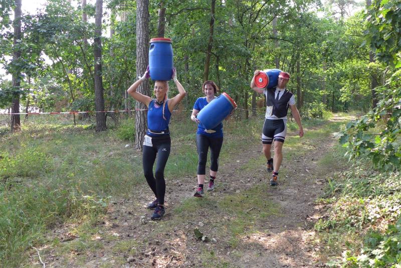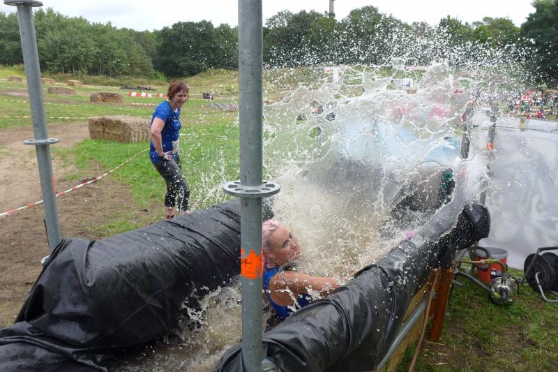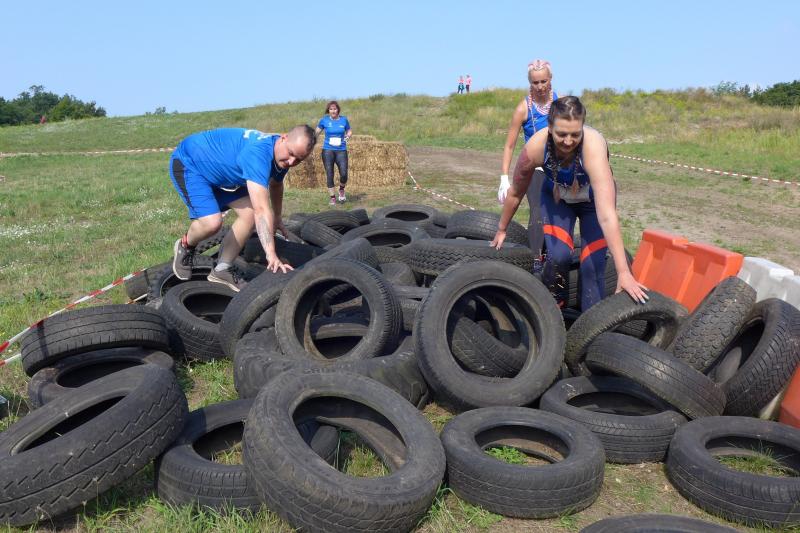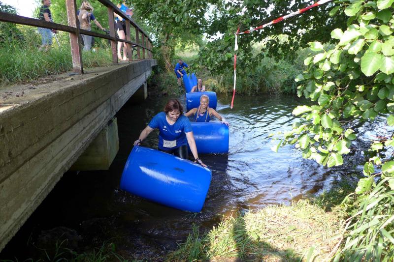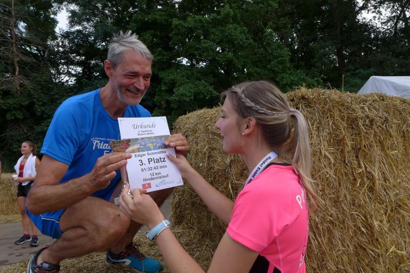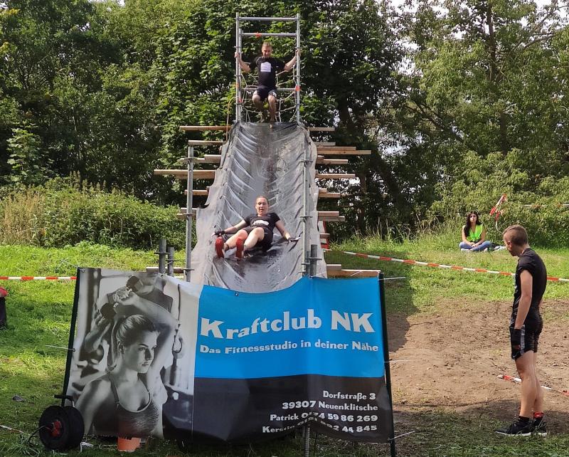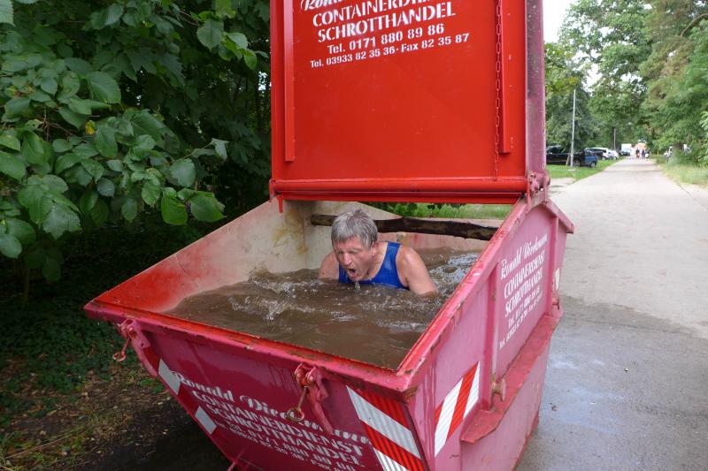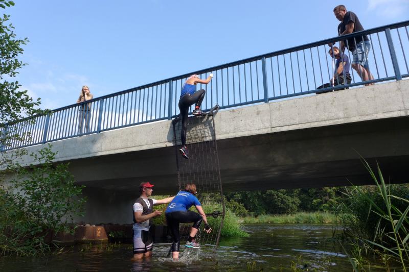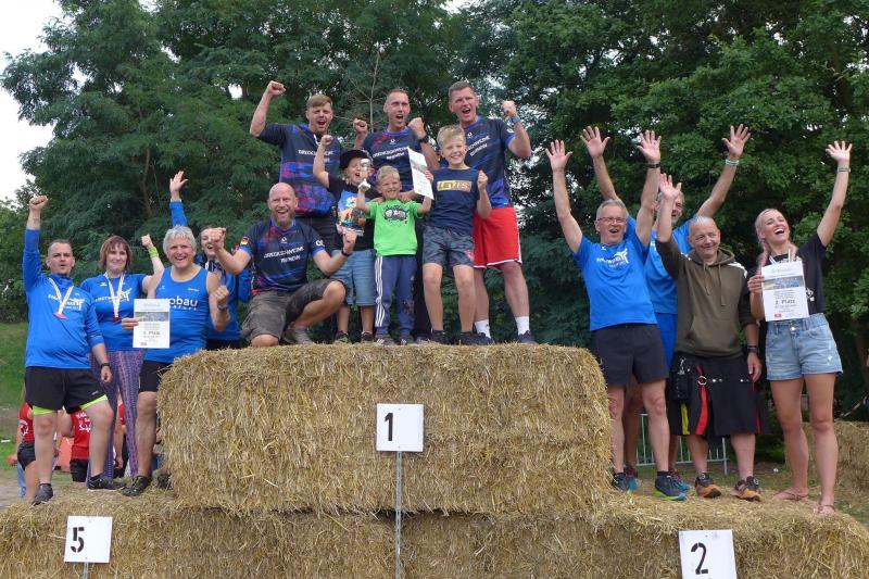 Umso mehr feierten die Gaensefurther ihre Schönherrs, als diese zur zweiten Runde aufbrachen. Dabei waren die insgesamt 44 Hindernisse oft nur durch teambildende Maßnahmen zu bezwingen. Gleich in der Arena, die traditionell eigentlich dem Rasentraktorrennen vorbehalten ist, konnten die Zuschauer die Bewältigung von Kriechgang, Strohballen, Kletterseil und Hangelanlage verfolgen. Nach der ersten Matschepfütze ging es dann im Tauchgang durch einen Container voller Wasser. Finzelberg hatte vorgesorgt, zauberte ihre Schwimmbrille hervor und hatte wieder alle Lacher auf ihrer Seite. Klitschnass kämpfte sich die Truppe dann durch stachliges Gestrüpp, wo nur ein wild verlegtes Flatterband den Weg aus dem dichten Wald verriet. Hier war nicht an Laufschritt zu denken, man musste eher koordinieren wo der nächste Schritt hingehen sollte. Nach Sandsack- und Holzstammschleppen und fast trocken hinter den Ohren, folgten die nächste Flussdurchquerung mit Fässern und ein Herüberhangeln an einem Seil. Alle möglichen Techniken wurden ausprobiert, alle landeten meist wieder im drohenden Nass. Den nächsten Steilhang hoch und auf`m Hintern wieder runter, bevor erneut der Kanalzubringer durchschwommen werden musste. Der abenteuerliche Ausstieg über das Brückengeländer gelang mit hilfreichen Händen besser, bevor der Puls auf der anschließenden Laufeinheit entlang des Elbe-Havel-Kanals langsam wieder zur Ruhe kam. Nach bezwungener Spundwand wurde die Arena kurz angelaufen und mit dem Jubel der Zuschauer verschwanden „SchlammBada“, die „Dreckschweine Rhinow“ und auch die „Matschgänse“ noch einmal hinter dem Genthiner Rodelberg, um schwere Autoreifen von A nach B zu transportieren. „Es kam uns jetzt viel schneller vor!“, resümierten die tropfnassen Schönherrs, die erst noch ihre Medaillen in einem Tauchgang aus dem großen Wassercontainer fischen mussten. Ob das nun daran lag, dass man die Hindernisse in der zweiten Runde besser bewältigen konnte oder dass zwei Flaschen Spülmittel auf der Rutsche ihre Finisher schneller ins Ziel beförderte? „Großartig - ihr habt das komplette Ding durchgezogen!“, wurden Aileen und Jörg von den wartenden Bode-Runners mit Handschlag im Ziel begrüßt!