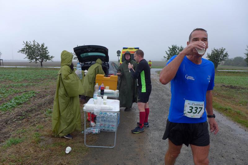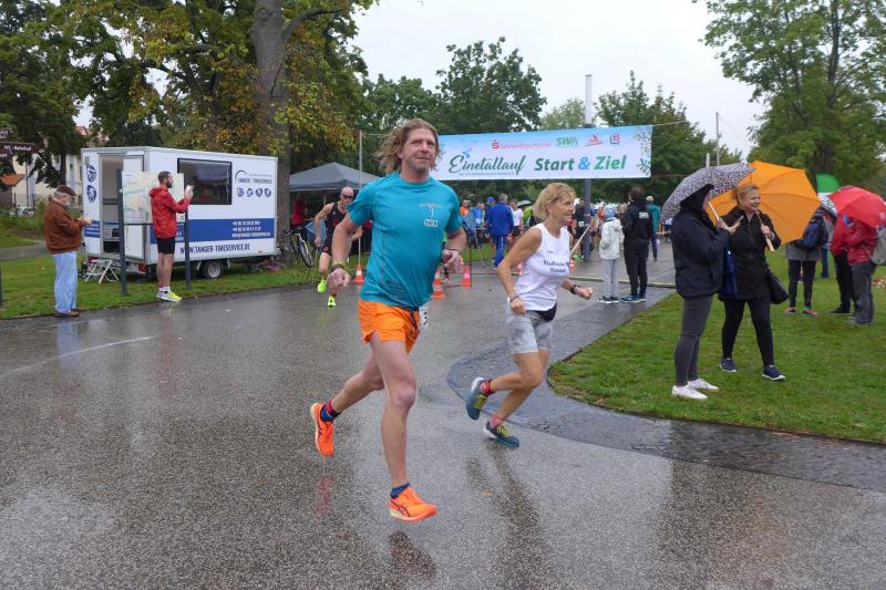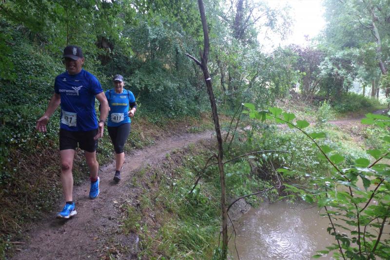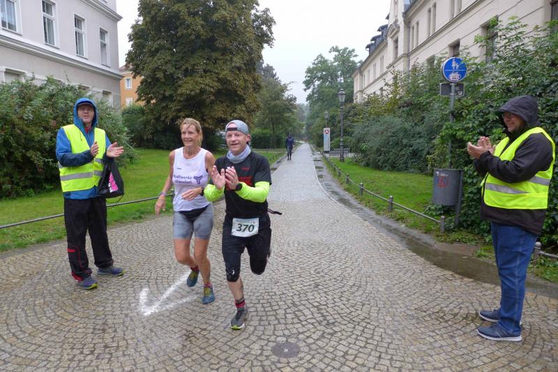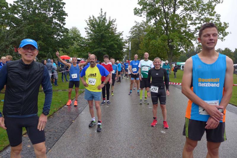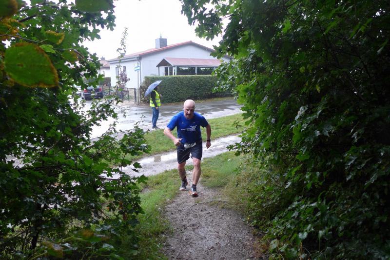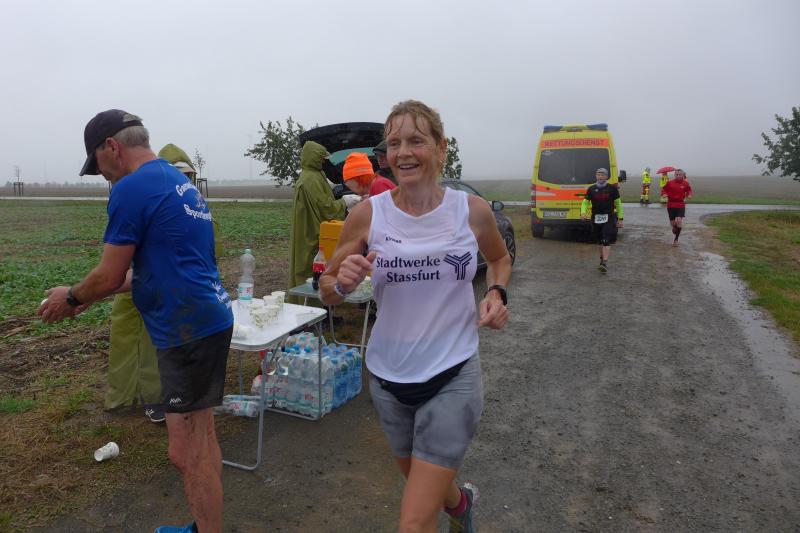 Die LSG Ascania schaffte mit ihrem neuen Start- und Zielbereich an der Herrenbreite eine besondere Atmosphäre zur 40. Jubiläumsauflage und bei der Größe der Parkanlage, war das pandemiebedingte Abstandhalten auch kein Problem. Nur den anhaltenden Regen hätten sich eine Woche zuvor wohl eher die Veranstalter der Genthiner Matschwolke gewünscht. Aber bekanntlich kommen ja nur die Harten in den Garten und so pfiff Paparazzi Börner seine Bodis im feinsten Nieselregen zur Fotoaufstellung vor dem Startbogen zusammen. „Leute, die Matten sind scharf!“, hallte es aus dem Messwagen der Zeiterfassung. Wie ein aufgescheuchter Hühnerhaufen sortierten sich die Lauffreunde entfernt der verlegten Messschleife neu, denn ein Kontakt hätte die Ergebnislisten der bereits gestarteten Walker arg durcheinander bringen können. Schnell noch ein Geburtstagsständchen für den Jürgen, der sich sehr über die vorgezogenen Starts und die damit näher rückende Kaffeerunde freute. Nahe am Ehekrach schrammte ein Bode-Runner-Pärchen vorbei, die es gerade noch schafften ihre Startunterlagen abzuholen: „Du musst auf die Laufstrecke!“, schickte sie den Gatten los, der nun zwölf Kilometer vor sich hatte, um das angestaute Adrenalin abzulaufen. Bei all der Aufregung geriet fast der Start von Debütantin Anke Delius ins Hintertreffen. Wie ein Routinier reihte sie sich aber in die lange Startaufstellung ein und zog ihre sieben Kilometer ruhig und ohne Gehpausen durch. Das kontinuierliche Training mit der Laufgruppe zeigte erste Erfolge und Delius lief nicht ohne Stolz über die Ziellinie. Nach langer Verletzungspause und mit etlichen Gehpausen über diese Distanz, war Sabine Börner wieder mit von der Partie. Einzig allein der dadurch errungene Mannschaftspunkt war das Ziel. Doch das gute Mannschaftsgefühl und die Tatsache, dass es langsam wieder aufwärts geht, waren allemal Lohn für die Quälerei. In Bestform und als schnellste Gaensefurtherin auf der Sieben-Kilometer-Distanz unterwegs, spulte Janine Wuwer ihr Rennen ab. „Das ist mein Wetter!“, freute sich die Sportlerin dann auch noch über ihren ersten Platz in der Altersklasse W40. Als „langer Kanten“ musste beim Jubiläumslauf die 18,5 Kilometer lange Strecke reichen. Führte 2019 der 25-Kilometer-Kurs noch über die Burg Arnstein, ging es diesmal schon kurz vor Welbsleben zurück, oft am Flüsschen Eine entlang, direkt wieder in das Zentrum von Aschersleben. Okay, die Strecke war kürzer aber dennoch sehr anspruchsvoll. So berichteten einige Finisher, dass sie auf Grund der Nässe die Wegmarkierungen nicht erkannten und dadurch einige Kilometer mehr zusammen kamen. Die aufgeweichten Sommerwege sorgten indes für abenteuerliche Rutschpassagen. Umso intensiver waren die Erfolgserlebnisse und die Streckenberichte dann im Ziel.