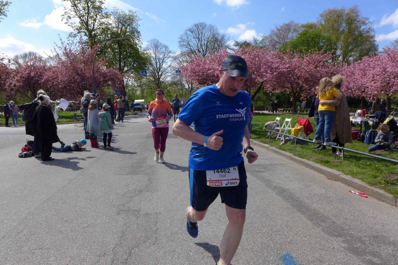 Während sich bei den Männern der Kenianer Cybrian Kotut mit einer Endzeit von 02:04:47 knapp vor Stephen Kissa aus Uganda mit 02:04:48 durchsetzte, lief Yalemzerf Yehualaw bei den Frauen eine sensationelle 02:17:23. Da war für Bothe gerade Halbzeit. Es ging weiter Richtung Stadtpark und die markante Kilometermarke 30 nährte sich. Weiter war Bothe noch nie gelaufen und unter Läufern ist bekannt, dass ab 30 der eigentliche Marathon beginnt. Daher hatten sich Tina und Sabine Börner in Ohlsdorf, dem nördlichsten Punkt der Strecke positioniert, um Bothe für die letzten zwölf Kilometer zu pushen. Die beiden wussten genau, wie jetzt jeder Schritt schmerzen konnte und der Abstand der Kilometerschilder scheinbar immer länger werden würde. Nun ging es nur noch in eine Richtung, nämlich in Richtung Ziel! Im Stadtteil Rotherbaum grüßten die Zuschauer noch einmal von der Außenalster, bevor es schnurstracks auf den Funkturm zuging.
