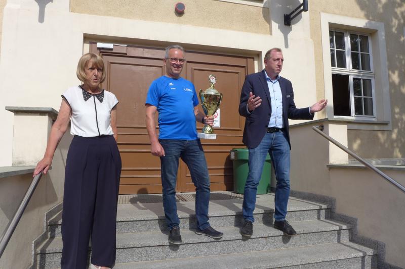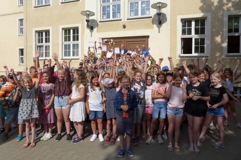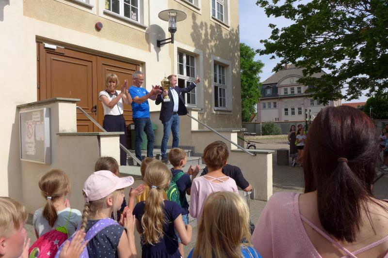 Feierliche Übergabe des Wanderpokals an die Goethe-Grundschüler durch Schirmherr und Veranstalter