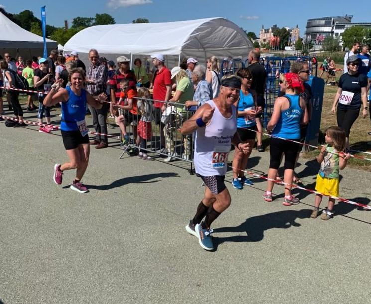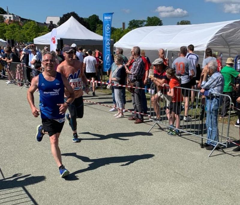 "Schon wieder kommt ein Gaensefurther ins Ziel!", hörten die Bode-Runners mit geschwollener Brust den Moderator gerne sagen, bevor die letzten Schritte bis zur Ziellinie unter dem Beifall der zahlreichen Zuschauer erfolgten. Immerhin strahlten 13 leuchtend blaue Shirts der Gaensefurther Sportbewegung mit der Schweriner Sonne bei warmen 26 Grad um die Wette. Das Ausdrücken der Laufuhr und der obligatorisch, auswertende Blick auf Zeit, Distanz und Durchschnittsgeschwindigkeit gehörte ebenso zum Ritual, wie das Abklatschen der Lauffreunde, mit denen man unterwegs so viele Kilometer gemeinsam gekämpft hatte.