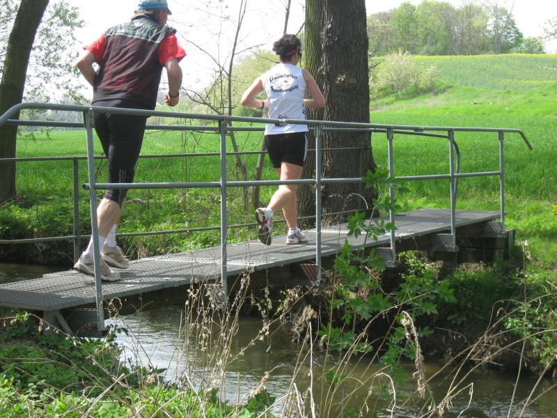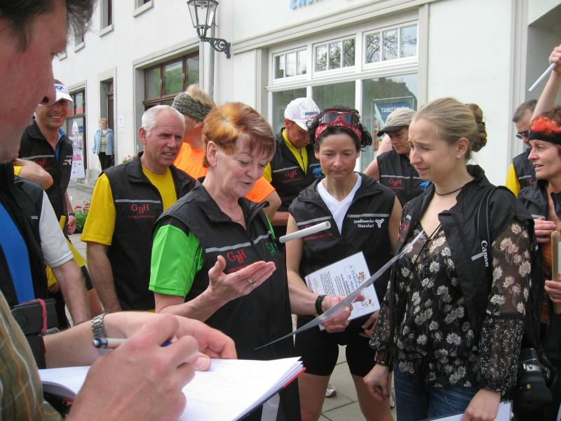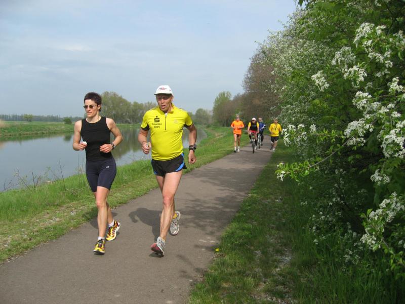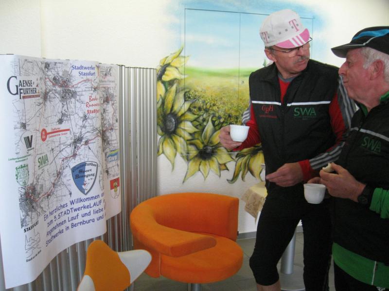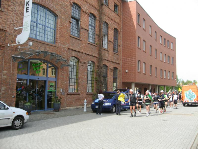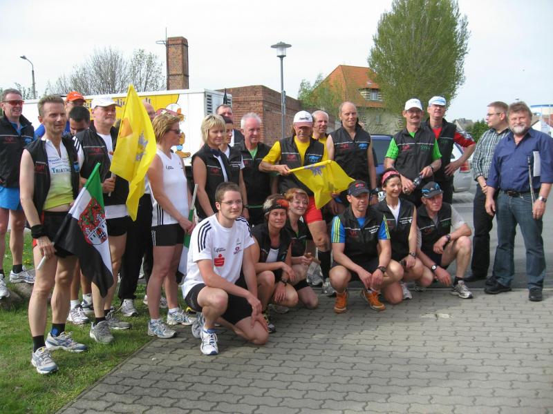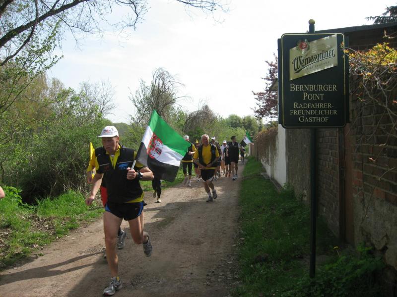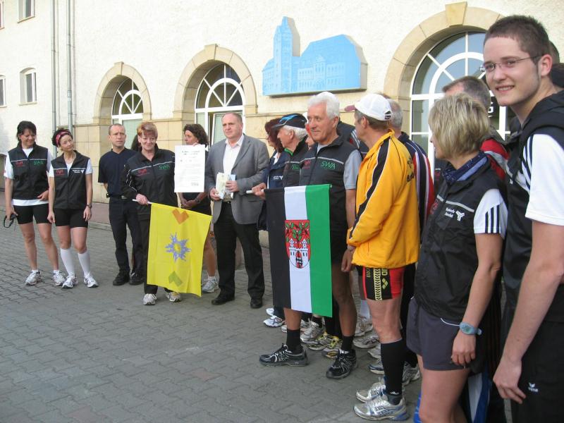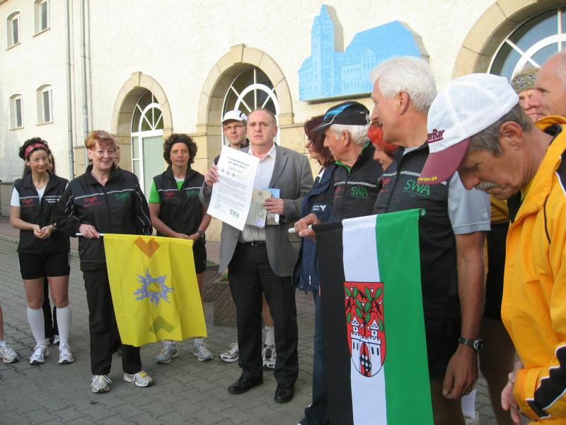 Nachdem sich zu früher Stunde bereits eine große Gruppe von Läufern der beteiligten Laufgruppen vor der Gaensefurther Schlossbrunnen Wüllner GmbH eingefunden hatte, verabschiedete deren Geschäftsführer Horst Braunisch die Teilnehmer, nicht aber ohne ihnen einen PKW voll mit erfrischendem Naß mit auf die Reise zu geben. Über die Roßbahn ging es dann zur 1. Etappe nach Staßfurt zu den Stadtwerken, wo die Läufer schon von OB René Zok und Betriebsangehörigen erwartet wurden. Die Übergabe der Staffelstäbe und die Einnahme einer kleinen Wegzehrung hingegen mussten zügig abgewickelt werden, hatte man doch durch einen Termin bei der LAGA in Aschersleben einen straffen Zeitplan vorgegeben. Wenn die Landesgartenschau für die älteste Stadt Sachsen-Anhalts das absolute Highlight des Jahres ist, warum nicht auch in den diesjährigen Stadtwerkelauf einbinden, dachten sich die Läufer von Ascania Aschersleben und sorgten damit für eine nette Bereicherung der Tagesplanes. Bei warmen, aber angenehmen Wind ging es weiter nach Bernburg, entlang der Bode und der Saale, deren Auen sich frühlingshaft geschmückt zeigten. Schon allein dieses Flair entschädigte für so manche Strapazen. In Bernburg bei den Stadtwerken angekommen, folgte dann der gewohnt herzliche Empfang mit Übergabe der Grußbotschaften, ergänzt durch einen leckeren Imbiß und weiter ging’s. An Verpflegung unterwegs mangelte es ebenfalls nicht. Die von Gaensefurther gesponserten Getränke und die Lunchpakete vom Speiseservice RiRo ließen diesbezüglich fast keinen Wunsch offen. Hatte trotz alledem ein Aktiver konditionelle Probleme, konnte er sich in einem der vier Begleitfahrzeuge erholen. 2 Sportler mussten leider ihren Plan, die gesamte Strecke durchzulaufen, nach 50 km aufgeben, denn das hohe Lauftempo forderte seinen Tribut. Bei dieser Eile übersah dann in den engen Promenaden von Aschersleben prompt ein Läufer einen Poller und es kam zu einer schmerzhaften Kollision. Aber zum Jammern blieb wenig Zeit, denn die Landesgartenschau wartete. Auf der Bühne im Weingarten war dann einige Prominenz versammelt und mittendrin unsere Helden mit den flinken Beinen, überwältigt vom folgenden Blitzlichtgewitter. Nachdem die eigentliche Mission des Laufes, die Übergabe einer Grußbotschaft auch an die Stadtwerke Aschersleben abgehandelt war, die die gute Zusammenarbeit auf kulturellem, wirtschaftlichen und natürlich sportlichem Gebiet dokumentieren soll, folgte die letzte Etappe der insgesamt 70 km langen Strecke.