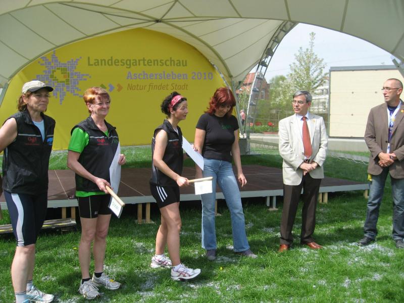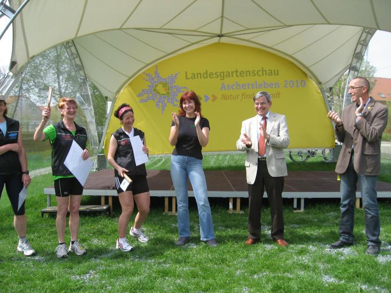 „Gartenschauen sind Akzeptanzkatalysatoren. Hier in Aschersleben natürlich für die Stadt, den gärtnerischen Berufsstand und die politische Ordnungseinheit des Salzlandkreises. Und genau an dieser Nahlinie kommen Gartenschau und STADTwerkeLAUF zusammen. Beide werben eigentlich für die gleiche Sache“, so Jürgen Herzog, „grüner“ Geschäftsführer der Landesgartenschau Aschersleben 2010 GmbH auf der Bühne bei der Verkündung der Botschaft. Peter Heister, der Geschäftsführer der Stadtwerke Aschersleben, einer der Hauptsponsoren des STADTwerkeLAUFs, sieht das ähnlich. „Wir sind gern dabei, wenn es um eine gute Sache geht und Menschen für etwas begeistert werden können.“