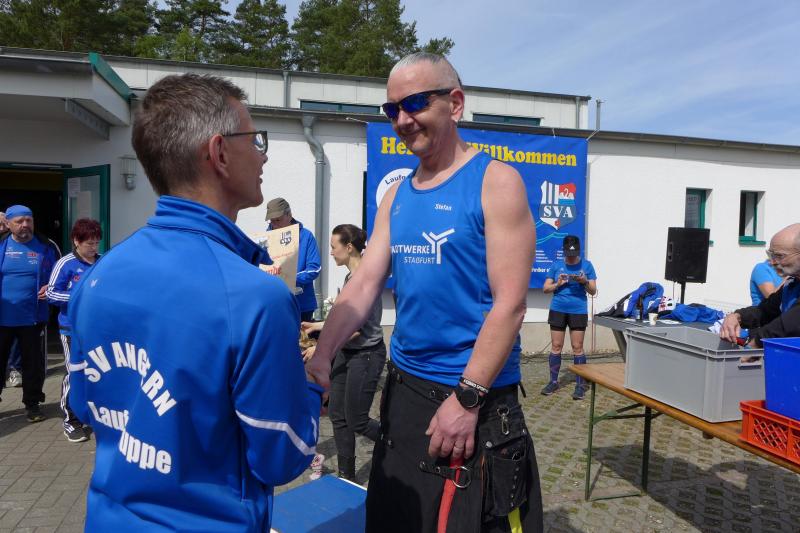 Vor dem zurückliegenden langen Wochenende konnten die Bode-Runners der Gaensefurther Sportbewegung bereits am Freitagnachmittag wieder ihrem Hobby frönen und auf dem Sportplatz des Polizei-Sportvereins Bernburg die Laufschuhe schnüren. Der gastgebende Verein hatte zum vierten Stundenlauf auf die weiche Tartanbahn eingeladen und 25 Mannschaften folgten dieser Einladung auch. Entgegen der Vorjahre waren bei der vierten Auflage neben Firmen und Vereine auch erfreulich viele Kinderstaffeln mit am Start. Die Gaensefurther stellten eine Damen- und zwei Männerstaffeln, wobei die letztere auf Grund eines Ausfalls beinahe nicht startberechtigt war. Doch Valentin Wuwer sprang ein und komplettierte als vierter "Mann" das Team wieder. Damit der Staffelwechsel auch flutschte, wurde die Technik im heimatlichen Stadion der Einheit vorher fleißig geübt. Dabei waren die Staffelstäbe aus den Zeiten, als es in Staßfurt noch einen Nikolauslauf gab. Damals flitzten die teilweise verkleideten Läufer um die Wette und gaben den Stab nach einer absolvierten Runde an den Laufpartner weiter. So ähnlich funktionierte es in Bernburg auch, nur bei deutlich angenehmeren Temperaturen und mit vier Teilnehmern pro Team. Die Regenerationszeit, bevor man wieder auf die Bahn musste, war in Bernburg also deutlich länger. Bis zum nächsten Einsatz hielt man sich am besten mit dem Anfeuern der Vereinskollegen warm. Der Damenstaffel gelang das besonders gut, denn bei der Platzierung konnte sie sich den dritten Platz sichern.