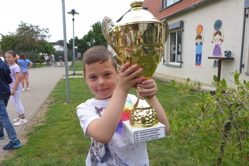 Aufregender konnte das Schuljahr für die Mädchen und Jungen der Förderstedter Grundschule nicht zu Ende gehen. Pünktlich zum Zeugnistag wurde ihnen mit großem Bahnhof die glänzende Siegertrophäe des Stadt-Pokal-Laufs durch Bürgermeister René Zok überreicht. Der Stadt-Pokal-Lauf der Grundschulen fand im Rahmen des 5. Staßfurter Salzland-Laufs am 2. Juni statt.
