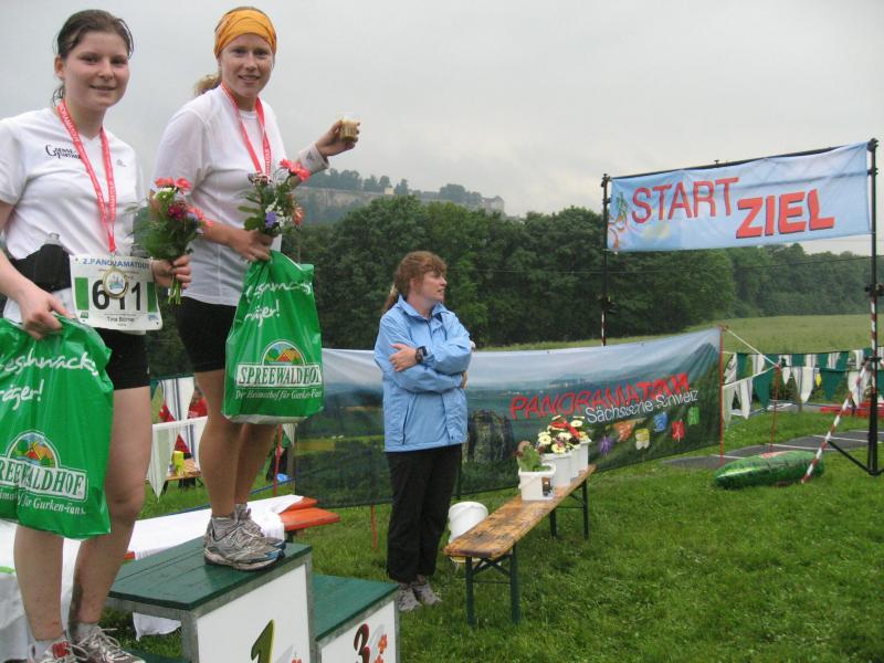 Die zweite Auflage des Panoramalaufs durch die Sächsische Schweiz, der am Sonntag durchgeführt wurde, nahmen Jens-Uwe und Sabine Börner (Gaensefurther Sportbewegung) sowie Tochter Tina (Hamburg) in Angriff. Bei idealem Wetter waren auf einer waldreichen 30 Kilometer langen Strecke entlang der Elbe 490 Höhenmeter zu überwinden. Jens-Uwe Börner (Altersklasse M 45/4.) benötigte dafür 2:33:52 Stunden. Gemeinsam ins Ziel liefen (v.l.) Sabine (Ak W 40/4.) und Tina (Ak W20/2.) nach 3:27:55 Stunden.