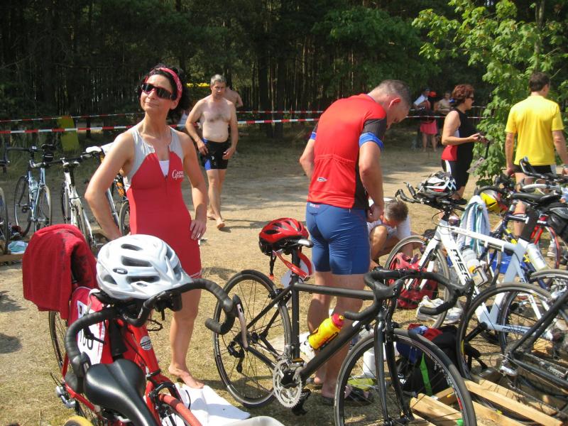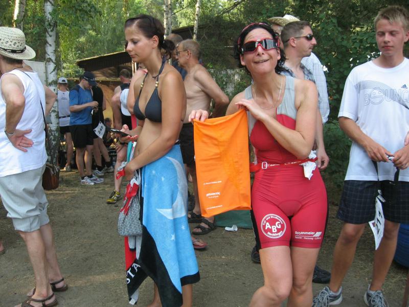 Ähnlich geschlossen verlief der Wettbewerb auch für Sabine und Jens-Uwe Börner, wenngleich die deutlich größeren Qualitäten der Dame einen beinahe zweiminütigen Vorsprung nach dem Schwimmen bescherten. Die Radstrecke indes "war so kurz, dass ich nicht mal meine Trinkflasche leer bekam", berichtete Sabine. Ein Kilometer auf der Laufstrecke musste vergehen, ehe sich ein bekanntes Stöhnen näherte. Einen Kilometer später begegneten sich die Eheleute aus Hecklingen sozusagen wieder auf Augenhöhe. Jens-Uwe zog also vorbei, musste an den Wasserständen wieder durchatmen, aber die Finisher-Handtücher im Ziel waren dann wichtig genug, um Sabine mit 19 Sekunden hinter sich zu lassen. Herr Börner belegte also in 1:18:37 Stunden den siebten Platz in der AK Senioren 2, Frau Börner wurde Zweite bei den Seniorinnen 1 in 1:18:56 Stunden. Aus Staßfurt nahm außerdem Stefan Masog teil, der den Wettbewerb in 1:24:56 Stunden absolvierte. Es gewann Jörg Knop aus Wolfsburg in 59:47 Minuten vor Peter Schwenzer (Einheit Rathenow/1:01:18 Stunden) und Franziska Tiex (USC Magdeburg/1:03:07).