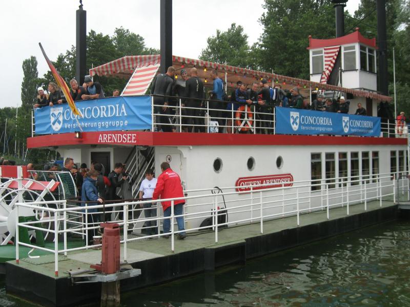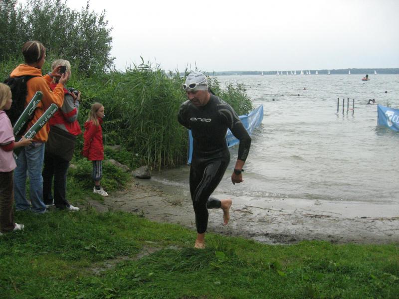 Da kann man wochenweise und kilometerweise trainieren, dieser Blick muss dem Athleten die Dimension einer 1,5 Kilometer langen Schwimmstrecke ganz neu erklären. Vom Ufer aus war der Startpunkt "Queen Arendsee", ein Raddampfer, nur in Umrissen zu erkennen. Vom Raddampfer aus sahen die Teilnehmer das Ufer als einen winzigen Strich zwischen Daumen und Zeigefinger gepresst. Das Wetter hatte plötzlich umgeschlagen, es hat geregnet, der Wind peitschte die Wellen hoch, was für miese Umstände - und was für ein fantastischer Wettbewerb. Torsten Blauwitz sagte am Ende: "Das waren genau meine Bedingungen." Dagegen hat Steffen Schöler bereits auf der Fahrt zum Startpunkt im Neopren gefroren. "Es hätte ruhig ein paar Grad wärmer sein können." Im See musste der 41-Jährige dann seine Brille abnehmen, weil sie mehr Wasser zugelassen als verdrängt hatte. Und doch, und da wusste man bereits um die starken Gaensefurther an diesem Tag, kam er noch vor Blauwitz aus dem See. Das ist nicht gewöhnlich. Torsten Born war zu diesem Zeitpunkt bereits im ersten Wechselgarten. Der Einzige, der Schwimmen als sein favorisiertes Element angibt, trottete diesmal nicht, er sprintete aus dem Nass. Der interne Kampf ging in eine zweite und sehr starke Runde.