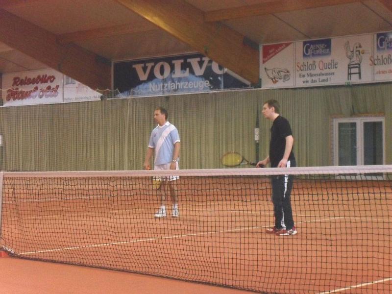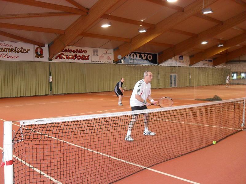 Im Vorfeld haben sich Doppelpartner gefunden, die über das gesamte Turnier gemeinsam antraten. Es spielten alle Doppel einmal gegeneinander, was insgesamt 21 Partien bedeutete, die jeweils nur über den langen Satz (Match-ende bei neun) ausgetragen wurden. Friedrich/Prüfer gaben keinen einzigen Satz ab und verließen den Court sechsmal als Sieger. Brian Dressler/Sebastian Haberecht (Grün Weiß Aschersleben) verbuchten fünf Siege, denn Friedrich/Prüfer ließen den beiden beim 9:4 keine Chance. Das spannendste Match lieferten sich Frank Müller/Ronny Selig und Manfred Rademann/Andreas Trensinger (alle Gaensefurth). Trensinger, der nach einer Verletzungspause wieder in den Spielbetrieb einstieg, legte mit seinem Partner einen Fehlstart hin. Das Duo lag schnell mit 2:7 zurück, drehte dann aber die Partie noch. Sie wehrten einen Matchball ab und siegten 9:8. Für Trensinger/Rademann bedeutete der Erfolg den dritten Platz.