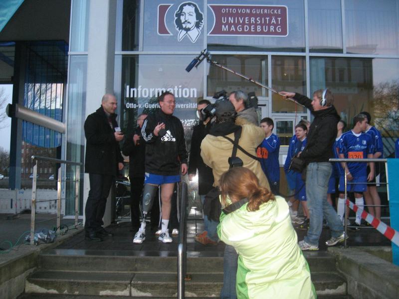 Bereits fest im Programm etabliert, startete zuerst der Kinderlauf mit 58 flinken Treppenstürmern. Auch für sie endete der Zielstrich erst nach 232 Stufen, in der 15 Etage des Campus-Towers auf dem Universitätsgelände. Unter der Maxime „zugunsten der Stiftung Behindertensport Sachsen Anhalt“, eröffnete MDR Sportmoderator Thorsten Melzer mit einer Beinprothese! den Hauptlauf in umgekehrter Richtung, nämlich treppab. Einen weiteren Ehrenstart absolvierte anschließend die U16 Mannschaft des FC Magdeburg. In die lange Warteschlange reihten sich dann auch sieben Staßfurter Starter der Gaensefurther Sportbewegung ein.