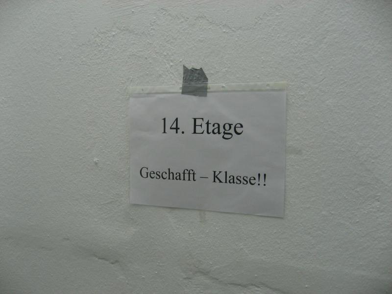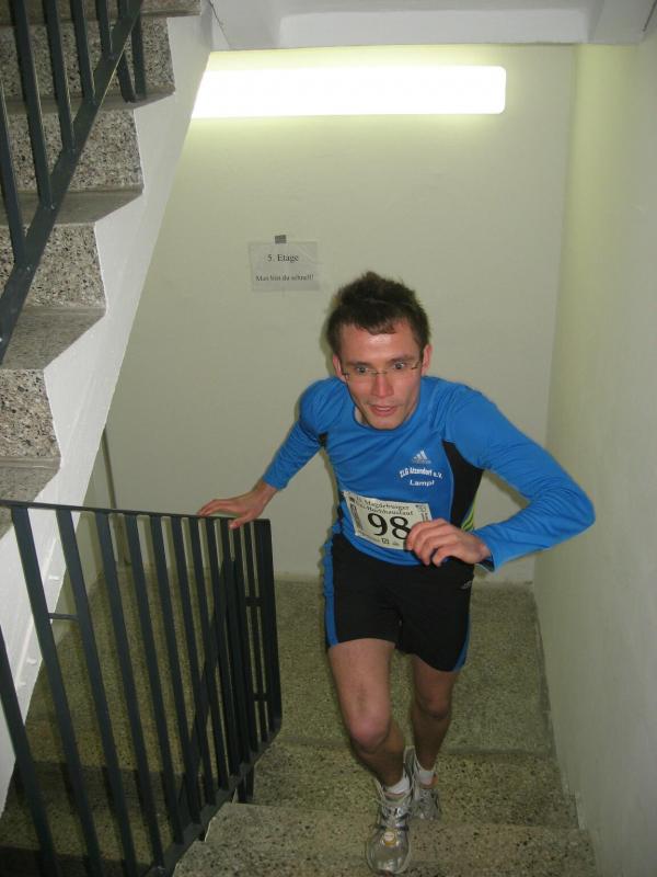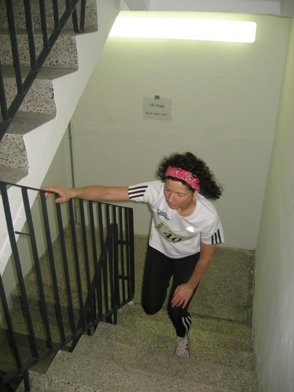 Routinier Jens-Uwe Börner, bereits das fünfte Mal dabei, sprintete als erster los. Nach 60 Metern Anlauf ging es über die ersten acht Stufen der Eingangstreppe in den Campus-Tower. Im Uhrzeigersinn folgte nun Etage um Etage. Ab dem zehnten Stockwerk war die Puste raus, elf, zwölf, dreizehn. Wo war hier eigentlich Schluss? 14. Etage, die Tür zum Treppenflur ist geöffnet, raus! „Wo ist denn hier das Ziel?“ haucht Börner einen Passanten an. „Na oben!“ zeigt der verblüffte Gefragte mit gestreckter Hand. Nein, welch ein Zeitverlust! Noch mal den Tritt aufnehmen, noch ein Geschoss und dort wartete auch schon die Zielkamera, wie immer in der 15. Etage. Keine Zeit für die Sanitäter oder ein Schluck Wasser, Börner nahm mit eiligen Schritt den Fahrstuhl nach unten um die Sportkollegen zu warnen: „Ihr müsst bis ganz oben durchlaufen, ich hab mich verlaufen!“ Spätestens jetzt waren die Debütanten Thomas Vetter und Olaf Moch richtig aufgeregt. Alle 30 Sekunden ging dann einer nach dem anderen auf den Höllentrip. Schnellster Staßfurter sollte Florian Börner werden, gefolgt von Johannes Höber, welcher in der Altersklasse bis 18 Jahre damit einen zweiten Platz landete. Die beiden Neuzugänge der Abteilung Triathlon machten richtig Speed und hatten am Ende ihren Spaß. „Das war ein Erlebnis!“ zogen sie zufrieden Resümee. Bei den Frauen belegte Sabine Börner in der Altersklasse ab 35 Jahre den ersten Platz, hinter ihr Andrea Krukowski auf Platz zwei. Auch in diesem Jahr wurde der Streckenrekord aus dem Jahr 2002 nicht geknackt: In 57,8 Sekunden bis in die 15. Etage - Wahnsinn!