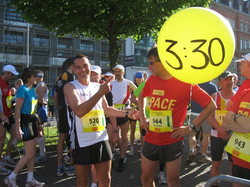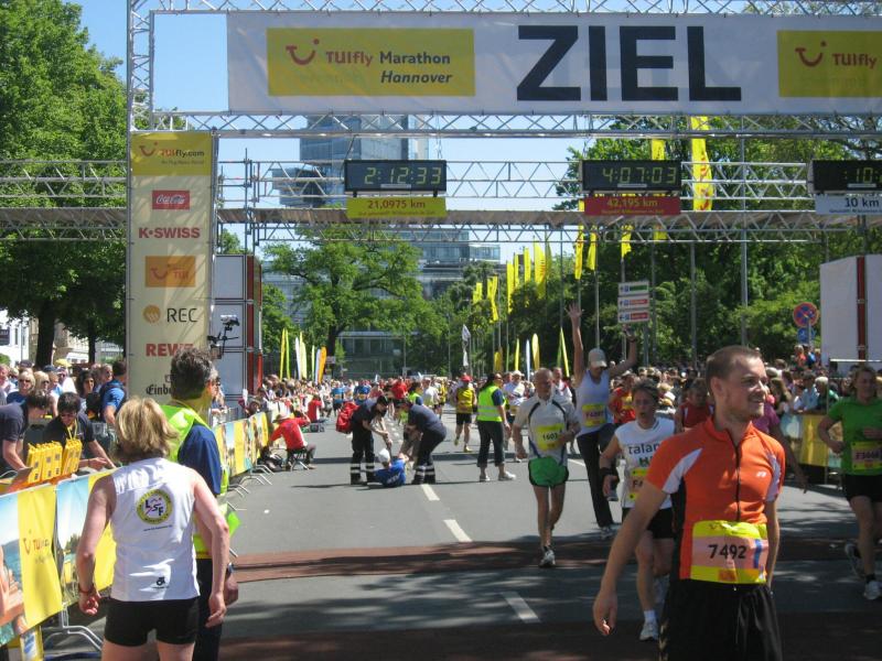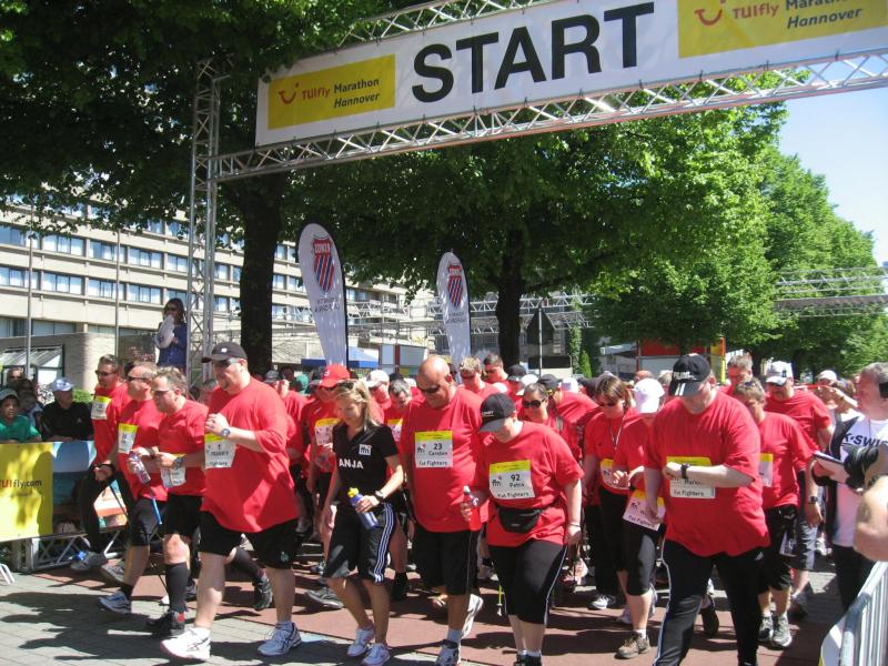 Am Abend vor dem Marathon wurden noch die besten Glückwünsche versendet, die Nachtruhe war unruhig und viel zu kurz. Bereits um 5:30 Uhr sammelte sich die erste Fahrgemeinschaft in Richtung Hannover und nach Parkplatzsuche und Startnummernausgabe breitete sich Dirk Meier als einziger der Mitgereisten auf seinen Marathonstart um 9:00 Uhr vor. Zeitgleich, aber im 500 Kilometer entfernten Prag, fieberte Lutz Klauß seinem ganz persönlichen Kampf entgegen. Beide Männer bereits des Öfteren über 42,195 Kilometer gestartet, wussten dass ihnen die bevorstehende Hitze wertvolle Minuten kosten kann, denn das Wetter ist ein Faktor welcher beim Wettkampf nicht zu beeinflussen ist. Entgegen dem Trainingszustand, den beide Sportler nicht dem Zufall überlassen hatten und optimal vorbereitet an den Start gingen. Die Tagesform passte und laut schallende Musikhits und die begeisterte Menschenmasse am Start ließen den Adrenalinspiegel unaufhörlich steigen. „Zehn, neun, acht“ zählten die Teilnehmer ohrenbetäubend. „Drei, zwei, eins – Start!“ Minutenlang schob sich der Tross über die Startlinie, ein Chip am Laufschuh befestigt, registrierte die genaue Startzeit. Neben tausenden Volksläufern kamen auch namhafte Top-Athleten wie Peter Kurui (am Ende zweiter Platz) oder Amos Matui (3. Pl.) an die Leine. Am Ende sollte Lusapho April aus Südafrika in 02:09:25 Stunden siegen, nur 10 Sekunden vor den starken Kenianern. Laufzeiten, von denen europäische Athleten meist nur träumen.
