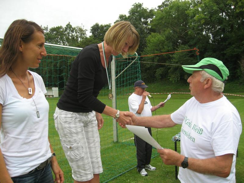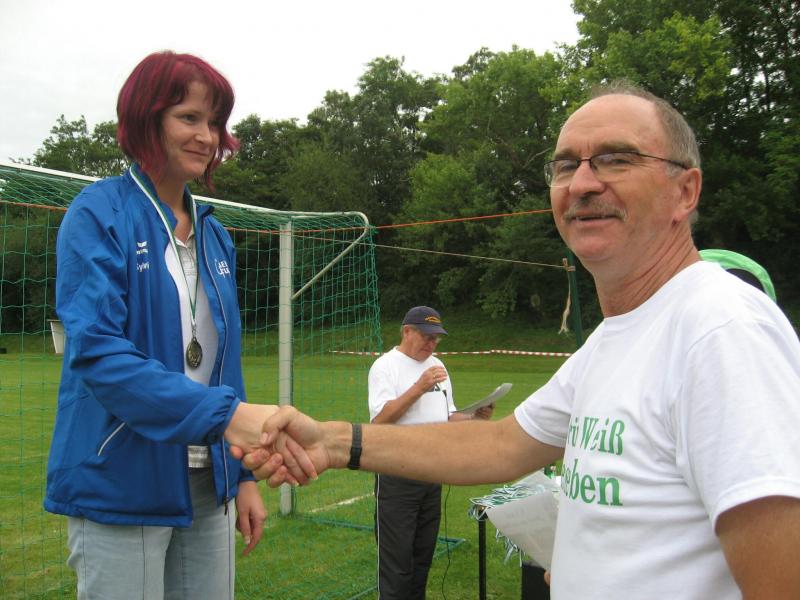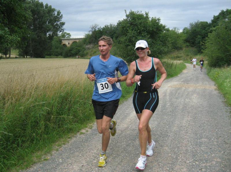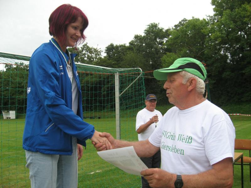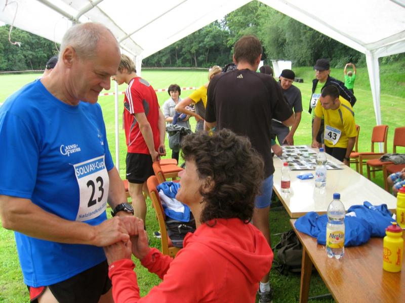 Um hartnäckige Verfolger muss sich Ina Schöler von der ZLG Atzendorf nun wirklich keine Gedanken machen. In Giersleben ließ sie die gesamte Konkurrenz über die 5,7 Kilometer stehen und sicherte sich den Gesamtsieg – mit 37 Sekunden Vorsprung vor Birgit Kohlenbach aus Aschersleben, gleichzeitig Nummer zwei in der Solvay-Cup-Wertung. Bisher hatte Schöler immer die Nase vorn, und wer die Atzendorferin am Sonntag gesehen hat, der wird keine Zweifel daran haben, dass sich das ändern könnte. Zusätzliche Motivation scheint Silvio Kelle von der TSG Calbe nicht zu brauchen. Nachdem er sich bereits bei der Anreise mit dem Fahrrad und dem Zug etwas aufgewärmt hatte, lief er noch vor dem Start mehrere Runden um den Sportplatz und hatte schließlich auf der „Zielgeraden“ noch genug Kraft, um Heiko Schimpf (TC Krumbholz Bernburg) und Uwe Goldhorn (SG Salzlandsparkasse) mit einem Sprint zu überholen und sich damit die Bronzemedaille in der M 40 zu sichern. Teamkollege Andreas Broska indes war froh, „nicht über die lange Distanz laufen zu müssen“, nachdem er sich beim Abzweig in Richtung Ziel davon überzeugen konnte, dass die Läufer über 13,6 Kilometer „noch einen harten Anstieg vor sich hatten“. Dennoch hatte er sich „bei gutem Laufwetter“ eigentlich mehr vorgenommen, wollte eine niedrige 40er Zeit laufen. Mit 45:56 Minuten sicherte er sich dennoch Platz eins in der A-Jugend und die Führung in der Gesamtwertung des Solvay-Cups.