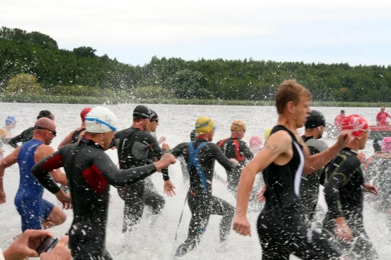 Die leichte Bewölkung und der böige Wind ließen auf gute Wettkampfergebnisse hoffen und so ging es 15 Minuten vor 11 Uhr vom Wechselgarten, der oberhalb des Hasse See liegt, hinunter zum Stand, wo pünktlich um 11 Uhr gestartet wurde. Es muss für die Zuschauer ein imposantes Schauspiel gewesen sein, als von 138 Athleten Arme und Beine das Wasser des Sees zu brodeln brachten, was die Athleten leider etwas anders sahen, denn hin und wieder von einer Hand oder auch schon gern einmal einem Fuß des Vorausschwimmenden getroffen zu werden erzeugt wenig Freude.