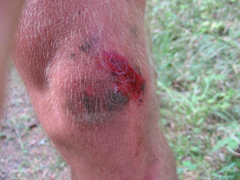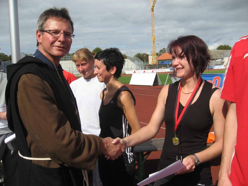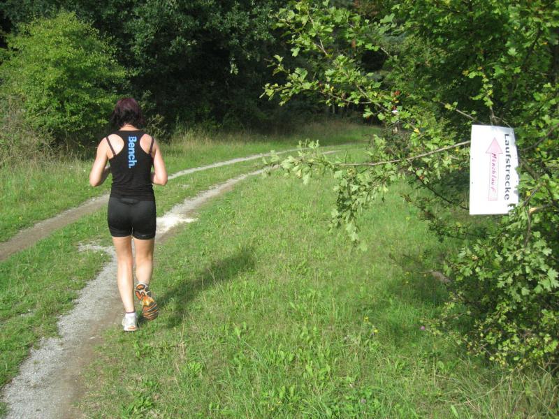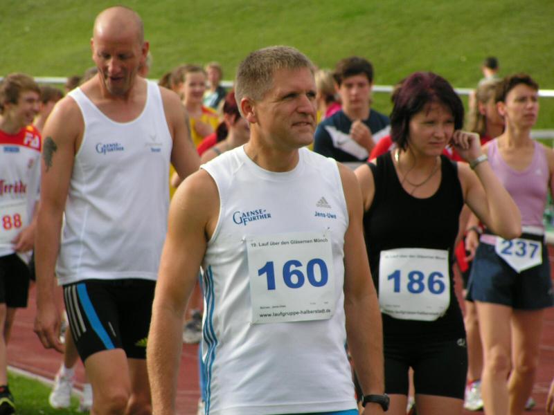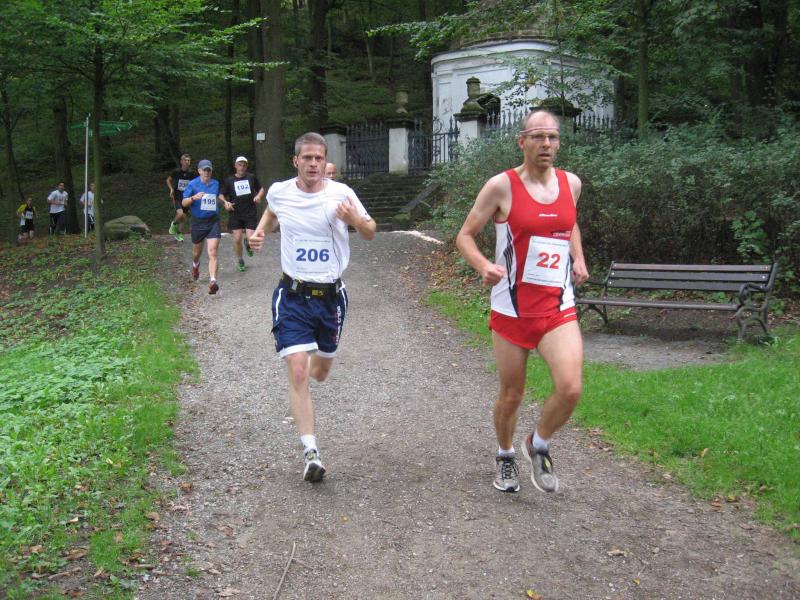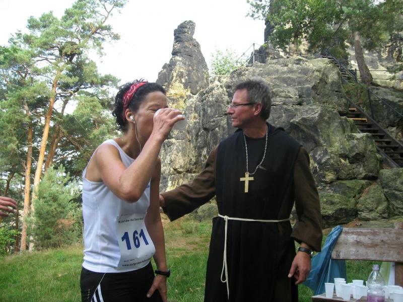 Spätestens mit dem Startschuss über 13 Kilometer waren die Gedanken an den bevorstehenden Muskelkater verschwunden und langsam reihte man sich im Tross der Laufverrückten ein. Die ersten sechs Kilometer verliefen in leichten Wellen, bevor die berüchtigte Treppe hinauf zum Gläsernen Mönch den Lauf abrupt stoppte. Quasi im Gänsemarsch zog sich die Menschenkette pustend die 230 Stufen hinauf, bis ein Mann im Mönchsgewand mit kühlem Nass und Bibel das Ende der Qual erahnen ließ. „Bitte lieber Gott, heile mich von dieser Laufkrankheit!“, konnte man vielen Gesichtern scheinbar entnehmen. Aber weit ab vom Start ging der Weg nur weiter und das zum Glück dann auch bald wieder bergab. Unaufmerksam und wie immer der Fotografie verfallen, stürzte Jens-Uwe Börner über eine Wurzel und konnte nun eine Wunde am Knie sein eigen nennen. Zu diesem Zeitpunkt gab er dann auch Schmidtschneiders Verfolgung auf, widmete sich ganz seinem Hobby und hakte den Lauf als gute Trainingsvorbereitung für den Magdeburg-Marathon ab.