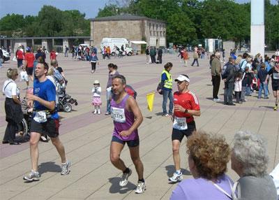 Adrenalin pur für über 9.000 Teilnehmer beim Startschuss vor der atemberaubenden Kulisse des Olympiastadions. Ein schneller Stadtrundlauf über 25 Kilometer, wo die Läufer an Sehenswürdigkeiten wie Siegessäule, Brandenburger Tor, Friedrichstraße, Gendarmenmarkt, Potsdamer Platz, Kurfürstendamm, Kaiser-Wilhelm-Gedächtnis-Kirche oder auch am Funkturm vorbei flitzten. Nicht alles davon bekam Renate Liedtke zu sehen, da sie über die zehner Distanz startete. So stand sie bereits geduscht zum Empfang der restlichen Bode-Runners bereit. Ist sonst bei einem Halbmarathon nach 21 Kilometern Schluss, geht es bei 25 Kilometern schon an die Substanz. Gut drei Kilometer vor dem Ziel waren bereits die Olympischen Ringe am Stadion zu sehen. Das Ende war scheinbar so nah, aber eine viertel Stunde Weg lag noch vor den Sportlern. Eine große Schleife lief man um die Arena, ehe man leicht abschüssig endlich den kühlen Tunnel unter der Tribüne erreichte. Laute Musik motivierte die Läufer und es folgten die letzten 300 Meter auf der blauen Tartanbahn bis zum Zielbogen. Cheerleader schrieen die Namen der Einlaufenden, Blitzlichtgewitter der Fotografen um den entscheidenden Augenblick festzuhalten. Dirk Meier bekam als erster Bode-Runner seine Medaille umgehängt. Von 3.243 männlichen Startern lag er auf Platz 436. Ihm folgten kurz darauf Michael Karg und Detlef Schäfer. Keine Podestplätze, die gingen nach Kenia, aber rundum zufriedene Gesichter. Dicht auf den Fersen der Männer, war in unglaublicher Bestform Petra Becker. Die 25 Kilometer absolvierte sie in 2:12:29 Stunden, was in der Gesamtwertung der Frauen Platz 115 von 892 Starterinnen bedeutete. Es folgten Sabine Börner und Lutz Klauß. Selbst nach durchstandener Nachtschicht ließ sich Klauß dieses Highlight nicht entgehen. Wer aber auf den letzten Metern sein letztes gab, hatte die Rechnung ohne den Wirt gemacht. Der Weg zum Ausgang, zu den begehrten Getränken und Duschen führte über geschätzte 100 endlose Stufen. Aber mit Zwischenstops wurden auch die gemeistert, schließlich wartete noch das Kulturprogramm. Ganz in Ruhe genoss man Berlin auf einer Spreerundfahrt und erkannte die Stellen wieder, die man bereits auf der BIG 25 Strecke in Turnschuhen zurückgelegt hatte.