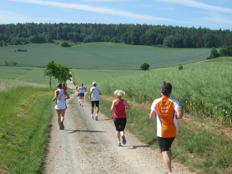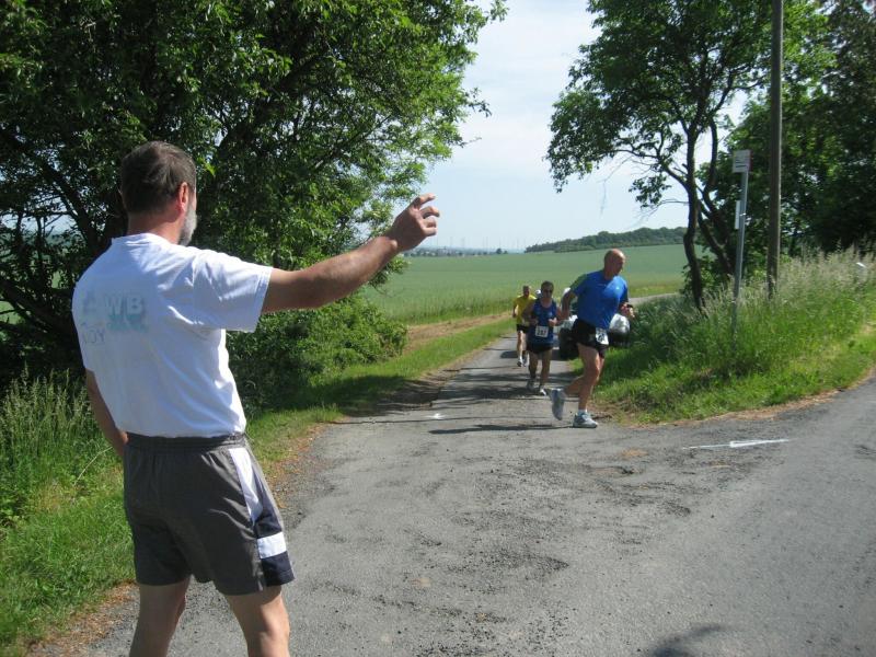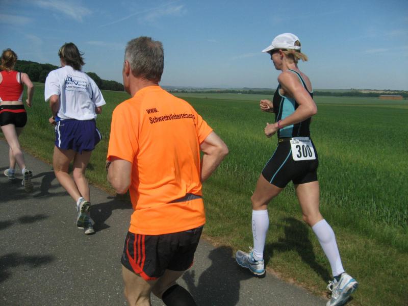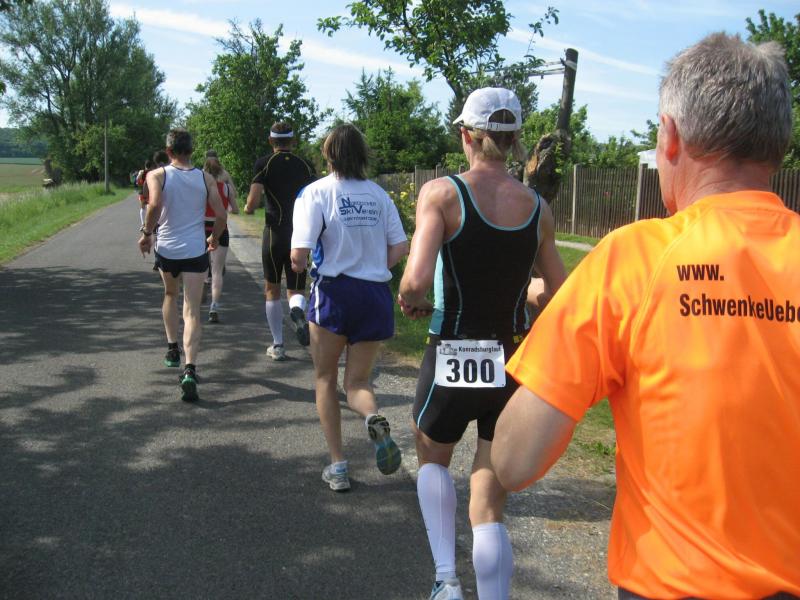 Als anspruchsvoll und für „Fortgeschrittene“ deklariert, sollte die Strecke ihrer Beschreibung durchaus gerecht werden. Bereits nach dem ersten Kilometer stieg die Asphaltstraße merklich an. Doch gerade als das Atmen zu anstrengend werden sollte, sorgte ein schattiger Waldweg wieder für Entspannung. Das Spiel zwischen Licht und Schatten erforderte die ganze Aufmerksamkeit der Läufer. Hatten die Veranstalter den quer liegenden Baum als Extra-Bonbon auf dem Weg drapiert? Wie bei der „stillen Post“ wurde vom Vordermann lauthals an den Verfolger weitergegeben: „Baum!“ Gehüpft, gegrätscht oder draufgetreten, die Barriere sollte für die Läufer kein Hindernis sein. Aus dem Wäldchen führte die Strecke hinaus auf die Felder. Bis zur Streckenteilung brannte die Sonne zusätzlich auf die erhitzten Köpfe. Streckenposten teilten nun die ankommenden Läufer auf: „Die Sieben Kilometer nach links, elf Kilometer nach rechts!“ „Machs gut, arme Bine“, verabschiedete sich Petra Becker von ihrer Vereinskollegin. Zusammen mit Heidi Schwenke vom BSV Eickendorf flitzte Becker nun in Richtung Konradsburg. Die Wahl der kürzeren Streckenlänge sollte sich am Ende gelohnt haben, denn beide Läuferinnen konnten in ihren Altersklassen auf das Siegertreppchen steigen.