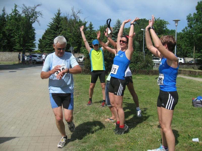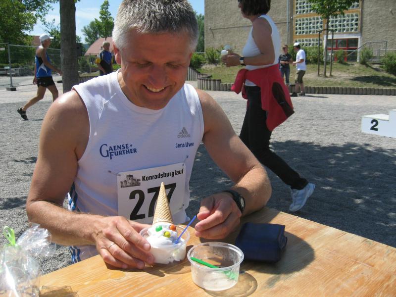 Sylvia Köhn freute sich riesig über den 1. Platz in der W 30, ebenso Jürgen Eisfeld, Triathlet der Gaensefurther Sportbewegung, in der M 70. Tröstende Worte fanden die Vereinskollegen für Börner: „Ach Jens-Uwe, letzter Platz!“ „Na und, dafür hab ich die meisten Fotos!“, grinste er und belohnte sich mit einer ordentlichen Portion Eis.