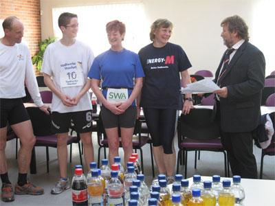 Da begleitende Fahrzeuge für die Getränkeversorgung und zum Personentransport zur Verfügung stehen, ist es kein Problem, auch mal zwischendurch zu pausieren. Eine Stärkung erwartet die Teilnehmer in den 3 Stadtwerken, nachdem eine mitgeführte Grußbotschaft übergeben ist. Auch der Sponsor aus Gaensefurth lässt es sich nicht nehmen, für das leibliche Wohl und die Fitness der Läufer zu sorgen.