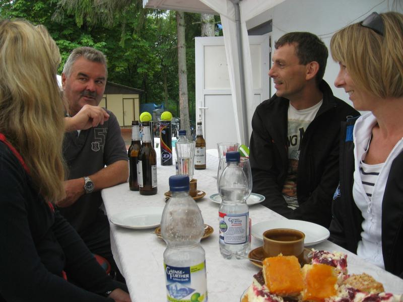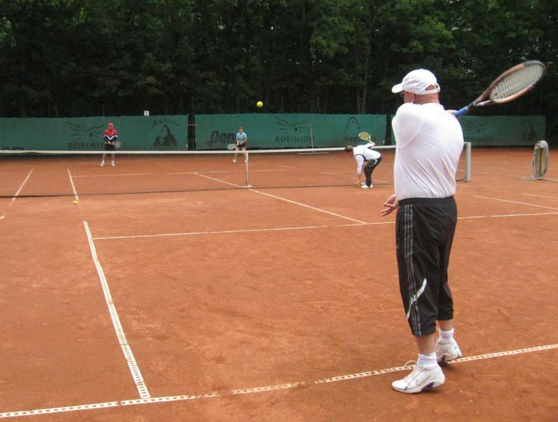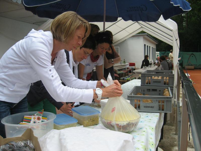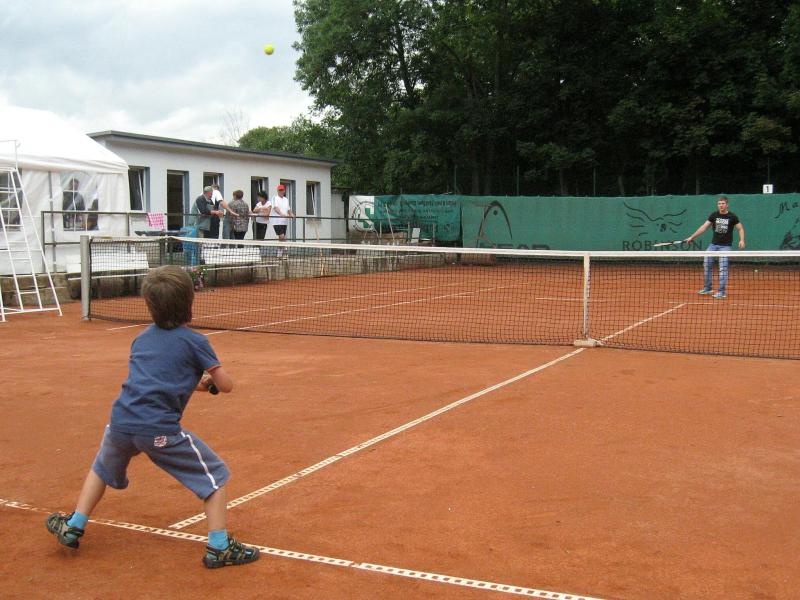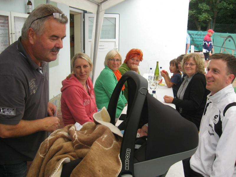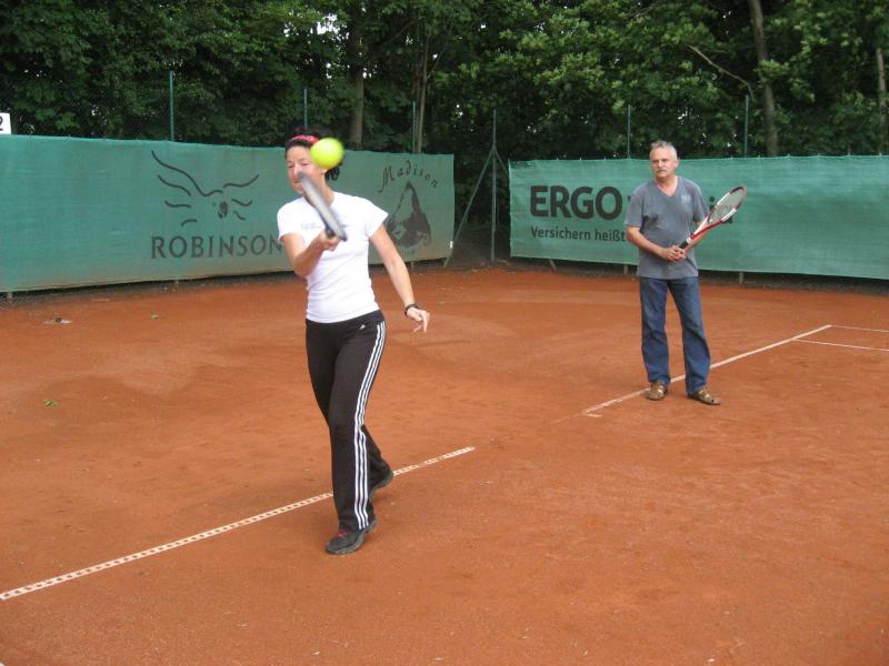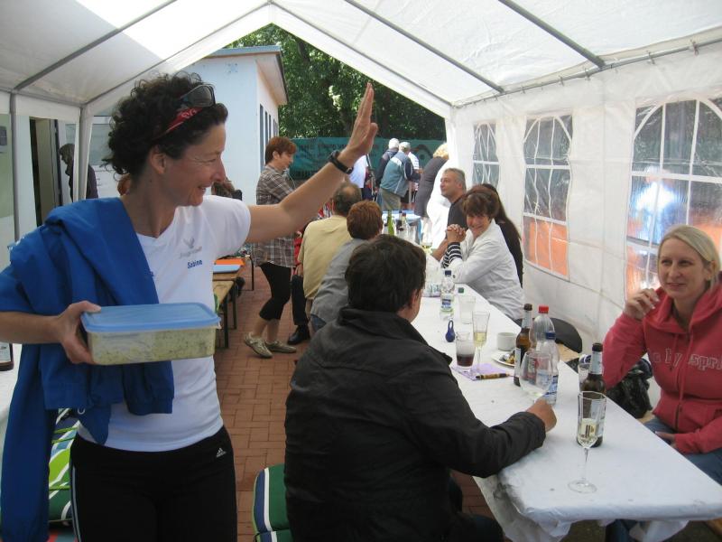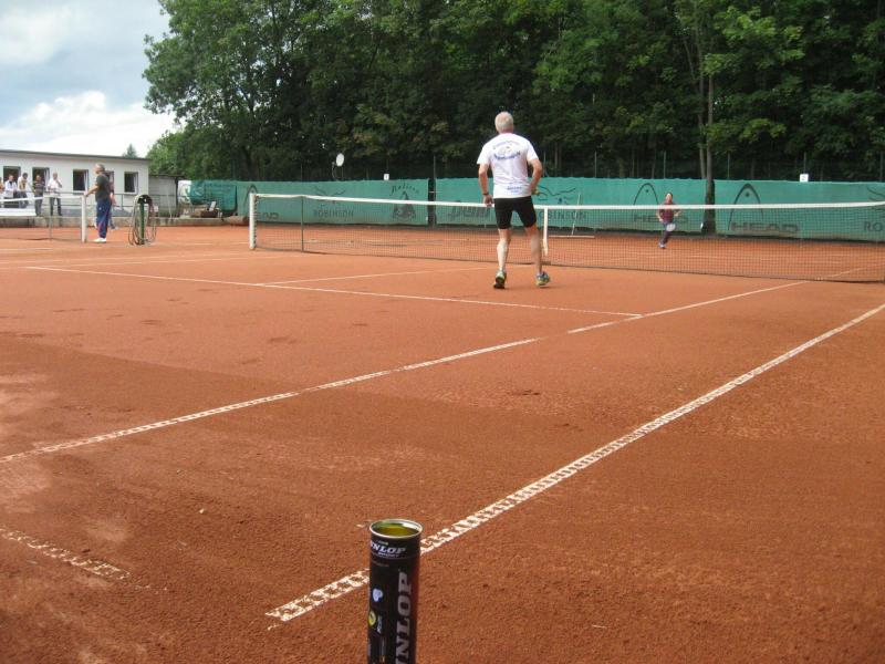 Hoch interessiert und motiviert fanden sich also Läufer und Triathleten auf den vier neu rekonstruierten Tennisplätzen ein. Vorerst bestaunte man die ebenfalls frisch sanierten Vereinsräume, waren doch die Plätze aufgrund heftiger Regenfälle noch mit großen Pfützen gespickt. Fleißige Tennisspieler waren aber bereits dabei, mit Riesenbesen die Plätze wieder bespielbar zu machen. Die Grills arbeiten dann auch bald auf Hochtouren und die Bierchen und lecker mitgebrachten Salate stimmten wohl sogar den Wettergott gnädig. Unter kompetenten Anleitungen wurde nun dem einen oder anderen Runner wohl zum ersten Mal Vor- und Rückhand erklärt. Nach ersten Aufschlagübungen und nahen Netzschlägen der Anfänger, lieferten sich Alleskönner und Profils bereits ordentliche Schmetterbälle, gekonnte Passierschläge oder Stoppbälle. Bis zum Abend hielt das rege Treiben auf den Plätzen an.