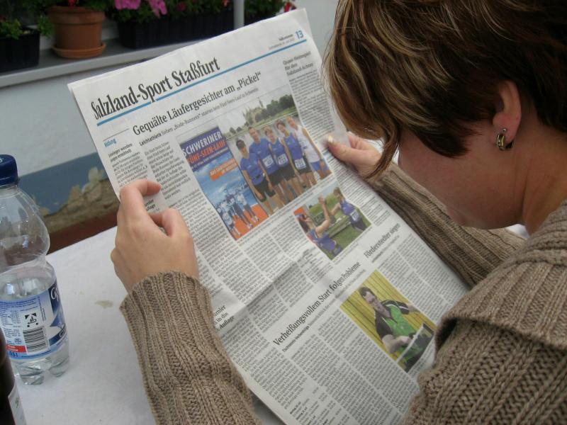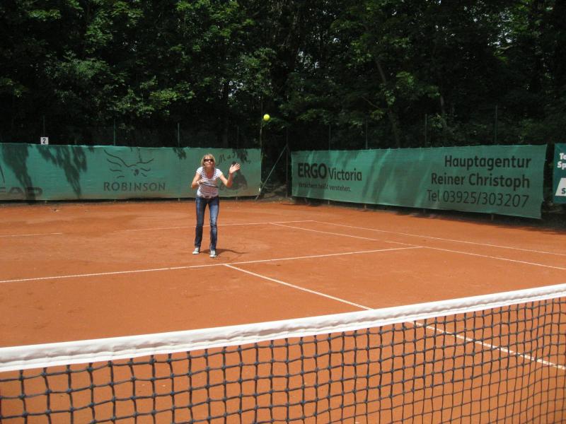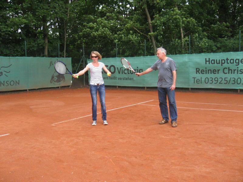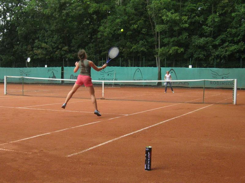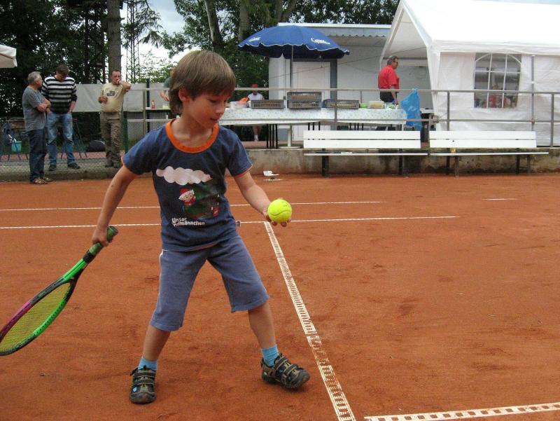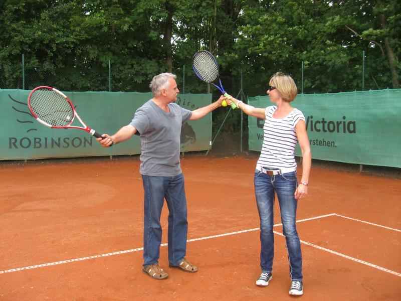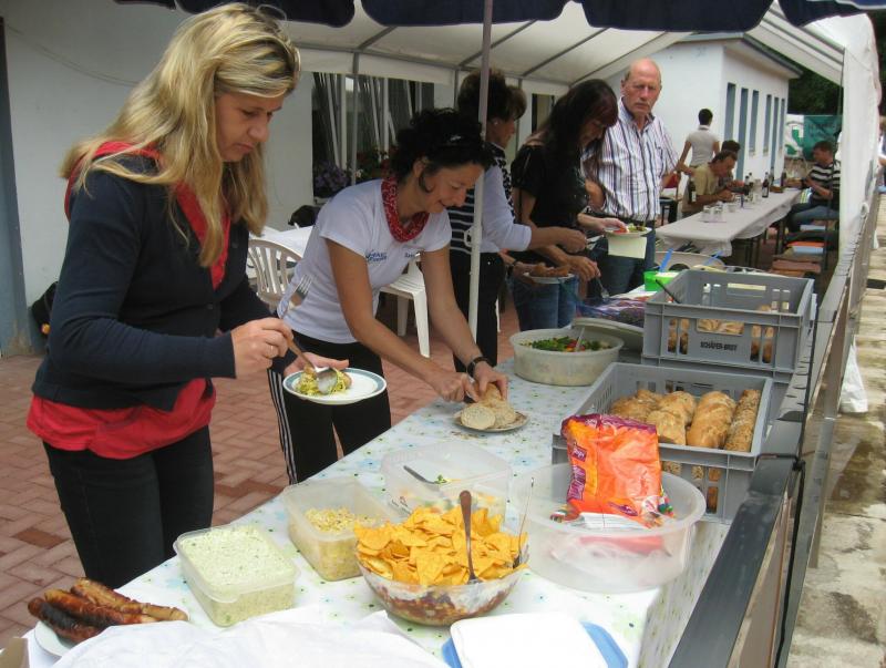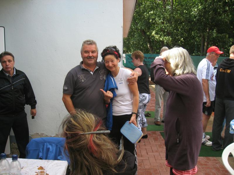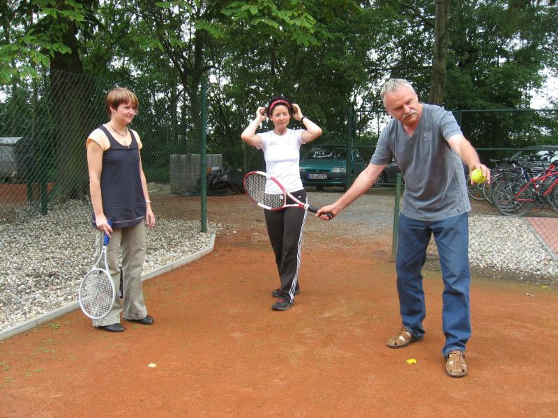 Hoch interessiert und motiviert fanden sich also Läufer und Triathleten auf den vier neu rekonstruierten Tennisplätzen ein. Vorerst bestaunte man die ebenfalls frisch sanierten Vereinsräume, waren doch die Plätze aufgrund heftiger Regenfälle noch mit großen Pfützen gespickt. Fleißige Tennisspieler waren aber bereits dabei, mit Riesenbesen die Plätze wieder bespielbar zu machen. Die Grills arbeiten dann auch bald auf Hochtouren und die Bierchen und lecker mitgebrachten Salate stimmten wohl sogar den Wettergott gnädig. Unter kompetenten Anleitungen wurde nun dem einen oder anderen Runner wohl zum ersten Mal Vor- und Rückhand erklärt. Nach ersten Aufschlagübungen und nahen Netzschlägen der Anfänger, lieferten sich Alleskönner und Profils bereits ordentliche Schmetterbälle, gekonnte Passierschläge oder Stoppbälle. Bis zum Abend hielt das rege Treiben auf den Plätzen an.