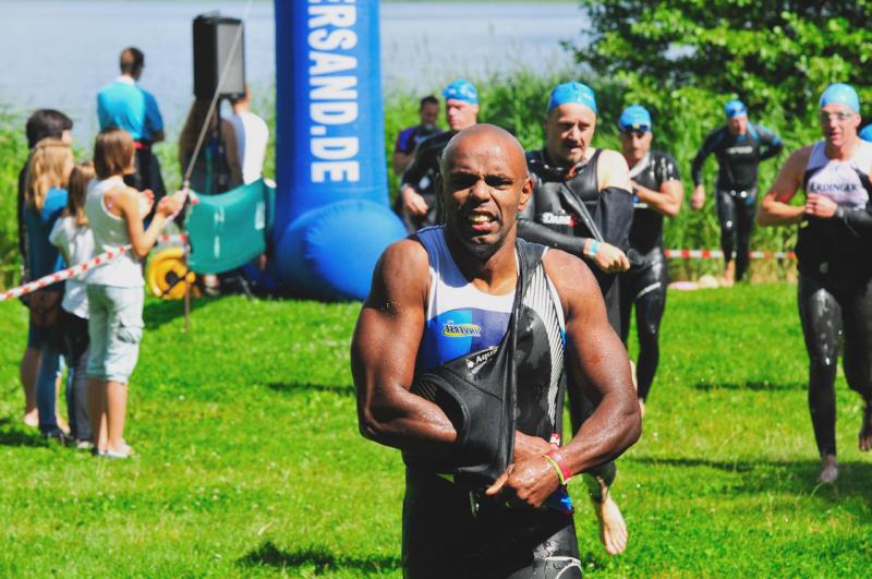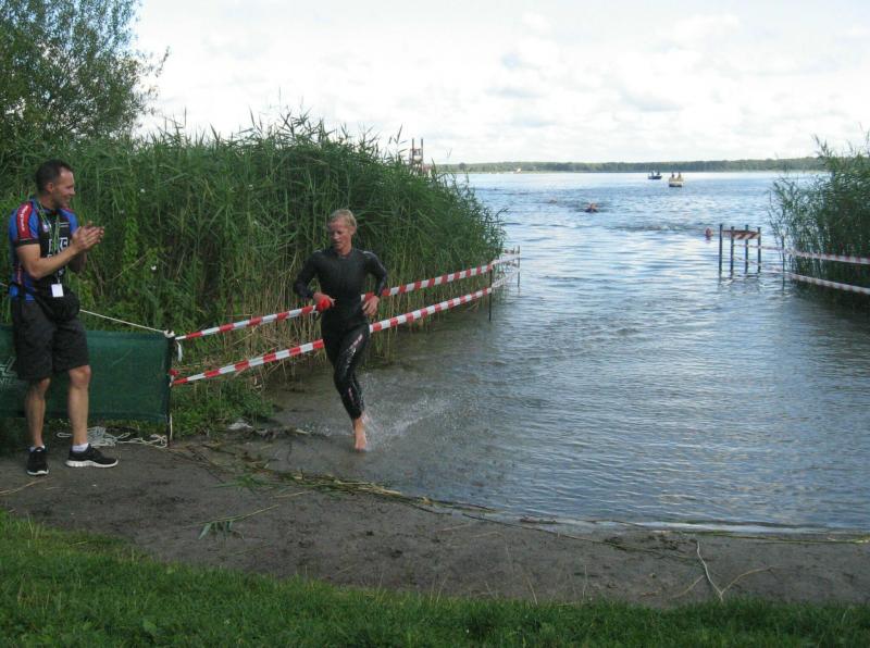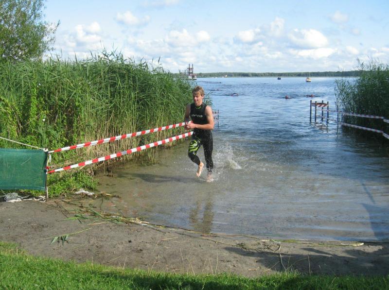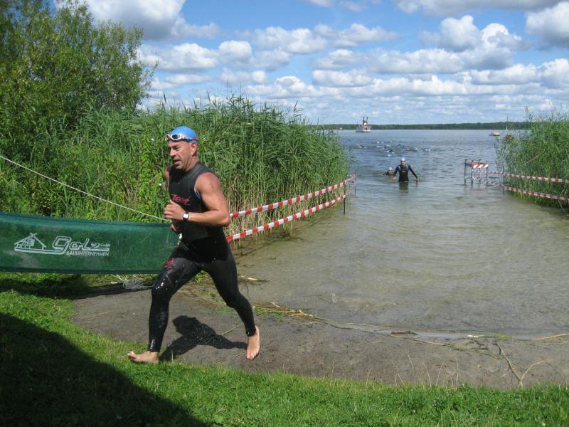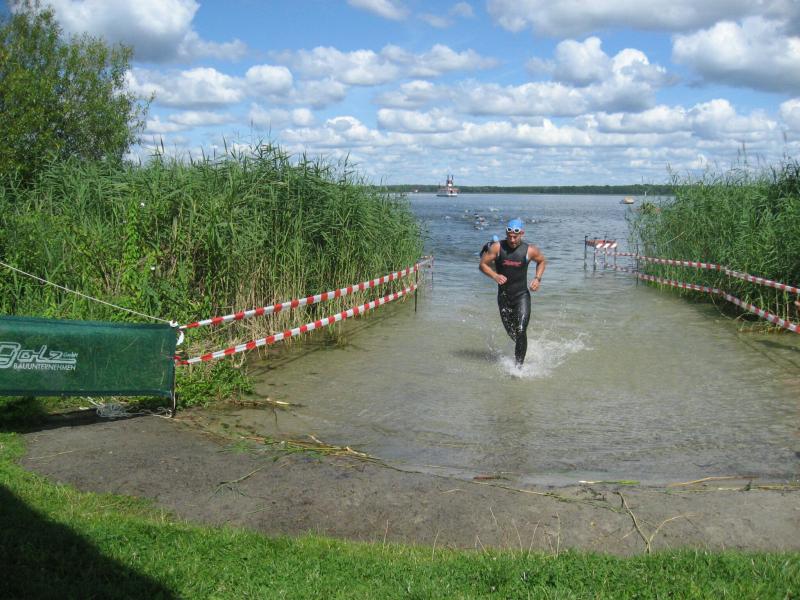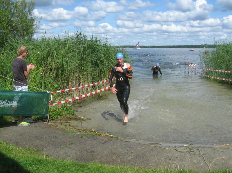 Nachdem der altehrwürdige Schaufelraddampfer "Queen Mary" die 110 Starter, darunter acht Gaensefurther, zum "fliegenden Start" ins Wasser befördert hatte, ging es schnurgerade wieder auf den Strand zu. Erstmals in Arendsee übrigens nicht mit motorisierter Begleitung, da sich einige Athleten in den Vorjahren über die Abgase des Begleitbootes beschwerten. "Vorneweg paddelte diesmal ein Drachenboot. Das war eine schöne Orientierung." Am dichtesten hinter der Zehn-Mann-Besatzung schwamm von den Gaensefurthern Abteilungsleiter Steffen Schöler, der nach 31:09 Minuten die Wechselzone erreichte.