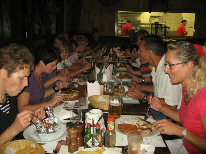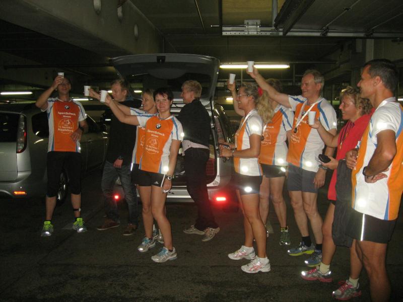 Und der Magdeburger SportSchecklauf war wirklich ein großes Event. Die Aufregung, aber auch die Freude, dass es nun endlich los gehen kann, konnte Claudia nicht verbergen. Verstärkt wurde die Anspannung nicht nur durch die 16 mitgereisten Lauffreunde, sondern auch durch die übrigen rund 3.000 Läufer, welche sich in orangenen Laufshirts bis kurz vor dem Start unter die bummelnden Freitagabend-Einkäufer mischten. Magdeburgs City war abgesperrt, die Läufer über die Fünf-Kilometerdistanz standen hinter dem Startbogen und Claudia Meier stand mittendrin. Nach Gruppenfoto und den üblichen guten Wünschen für den Lauf, hatte sich die Truppe im hinteren Feld einsortiert. Man wollte versuchen zusammen zu laufen, soweit das bei den Massen überhaupt möglich sein sollte. Fast zwei Minuten vergingen nach dem Startschuss, bis alle Bode-Runners die Startlinie überquert hatten. Nun lief auch Claudias Zeit. Über die breite Strombrücke verteilte sich das Läuferfeld recht zügig und erste weite Ausblicke auf die bunt beleuchtete Magdeburger Elb-Kulisse sorgten für Gänsehaut. Während Lauffreunde Anfangs mit gutgemeinten Sprüchen die Situation entspannen wollten, beruhigte Dirk mit Blick auf die Stoppuhr: „Genau dein Tempo!“ Aufgereihte Fackeln beleuchteten das dunkle Elbufer. Beeindruckt schob sich das Läuferfeld durch die Nacht, inzwischen war es 21.00 Uhr. Von weitem vernahm man bereits Trommler, welche die Läufer am Ende der Sternbrücke im Takt begleiteten. Durch die neu gestalteten Elbterrassen verschwanden die Sportler dann teilweise im Schatten des gigantischen Domgemäuers. Vorbei am Hundertwasserhaus war bereits der Startbogen zu erkennen. Während man im großen Feld die Lauffreunde für den Zieleinlauf ortete, kam das Gefühl, ´Schade, schon vorbei´. Claudia gab alles und auf den letzten 100 Metern sogar einen Sprint. So einige Bode-Runners hatten Mühe ihr zu folgen. Ja, auch das hatten sie trainiert! „Ach, hätten ruhig sechs Kilometer sein können!“, grinste sie bis an die Ohren und stellte sich mit Dirk noch einmal den Fotografen. Ausbaufähig, waren sich alle Bode-Runners der Gaensefurther Sportbewegung einig! Claudi, wir bräuchten da noch einen Staffelläufer für den Frankfurt Marathon…