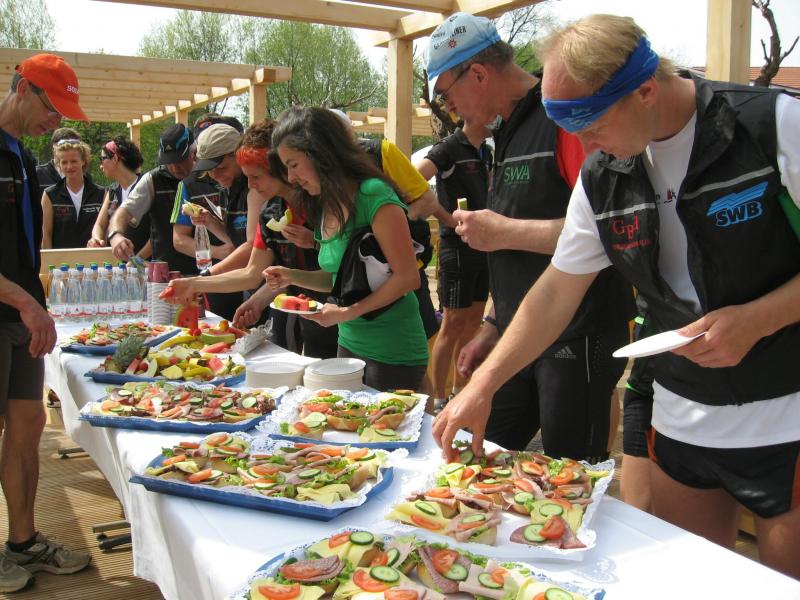 Nachdem sich zu früher Stunde bereits eine große Gruppe von Läufern der beteiligten Laufgruppen vor der Gaensefurther Schlossbrunnen Wüllner GmbH eingefunden hatte, verabschiedete deren Geschäftsführer Horst Braunisch die Teilnehmer, nicht aber ohne ihnen einen PKW voll mit erfrischendem Naß mit auf die Reise zu geben. Über die Roßbahn ging es dann zur 1. Etappe nach Staßfurt zu den Stadtwerken, wo die Läufer schon von OB René Zok und Betriebsangehörigen erwartet wurden. Die Übergabe der Staffelstäbe und die Einnahme einer kleinen Wegzehrung hingegen mussten zügig abgewickelt werden, hatte man doch durch einen Termin bei der LAGA in Aschersleben einen straffen Zeitplan vorgegeben. Wenn die Landesgartenschau für die älteste Stadt Sachsen-Anhalts das absolute Highlight des Jahres ist, warum nicht auch in den diesjährigen Stadtwerkelauf einbinden, dachten sich die Läufer von Ascania Aschersleben und sorgten damit für eine nette Bereicherung der Tagesplanes. Bei warmen, aber angenehmen Wind ging es weiter nach Bernburg, entlang der Bode und der Saale, deren Auen sich frühlingshaft geschmückt zeigten. Schon allein dieses Flair entschädigte für so manche Strapazen. In Bernburg bei den Stadtwerken angekommen, folgte dann der gewohnt herzliche Empfang mit Übergabe der Grußbotschaften, ergänzt durch einen leckeren Imbiß und weiter ging’s. An Verpflegung unterwegs mangelte es ebenfalls nicht. Die von Gaensefurther gesponserten Getränke und die Lunchpakete vom Speiseservice RiRo ließen diesbezüglich fast keinen Wunsch offen. Hatte trotz alledem ein Aktiver konditionelle Probleme, konnte er sich in einem der vier Begleitfahrzeuge erholen. 2 Sportler mussten leider ihren Plan, die gesamte Strecke durchzulaufen, nach 50 km aufgeben, denn das hohe Lauftempo forderte seinen Tribut. Bei dieser Eile übersah dann in den engen Promenaden von Aschersleben prompt ein Läufer einen Poller und es kam zu einer schmerzhaften Kollision. Aber zum Jammern blieb wenig Zeit, denn die Landesgartenschau wartete. Auf der Bühne im Weingarten war dann einige Prominenz versammelt und mittendrin unsere Helden mit den flinken Beinen, überwältigt vom folgenden Blitzlichtgewitter. Nachdem die eigentliche Mission des Laufes, die Übergabe einer Grußbotschaft auch an die Stadtwerke Aschersleben abgehandelt war, die die gute Zusammenarbeit auf kulturellem, wirtschaftlichen und natürlich sportlichem Gebiet dokumentieren soll, folgte die letzte Etappe der insgesamt 70 km langen Strecke.