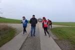 Und dann ging es auch schon los! Für die Kleinen auf die Ein-Kilometer-Runde durch den Ort, für die Großen in Richtung Autobahnbrücke. Am Ende des Läuferfeldes reihte sich auch Paula mit ihrem Frauchen ein. Ein Stückchen wollten sie nur mitgehen, wenn Frauchen nicht mehr kann, geht’s wieder zurück. Derweil waren die Läufer auf der Brücke angekommen und natürlich gingen freundliche Grüße an alle winkenden Autobahnfahrer. Bald waren 2,5 Kilometer absolviert und der Wendepunkt erreicht: „Auf der Stelle hopsen, das macht wieder warm!“, versuchten die Sportler den festgefrorenen Streckenposten wieder einzuheizen.
