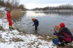 Vorsichtig, zum Teil barfuß, ging es den verschneiten Hang zum Ufer hinunter, bevor der große Zeh die Wassertemperatur prüfte. "Na zwei Grad sind es bestimmt!", stellten die Eisfüße erleichtert fest. Die freigelegte Badestelle war schnell ausgefüllt, so dass es nur in kleinen Gruppen in den Schachtsee ging. Mit 20 bis 25 Eisbadern hätte Rottstegge schon gerechnet: „Bei 40 haben wir aufgehört zu zählen!“, meinten die begeisterten Helfer, die nicht mit so vielen Teilnehmern gerechnet hätten. War für die Debütanten ein kurzes Eintauchen vollkommen ausreichend, hielten es die Profis schon einige Minuten im Eiswasser aus. Durchgezogen und eine echte Eisscholle in den Händen - das zauberte an diesem Tag ein stolzes Lächeln in viele Gesichter. Und entgegen den sonstigen Eisbadeterminen, an denen man den Elementen ausgesetzt ist, war das Anziehen im extra aufgebauten Wärmezelt blanker Luxus. Warme Getränke und eine leckere Bratwurst, die Bode-Runner-Eisfüße kommen im nächsten Jahr gerne wieder.